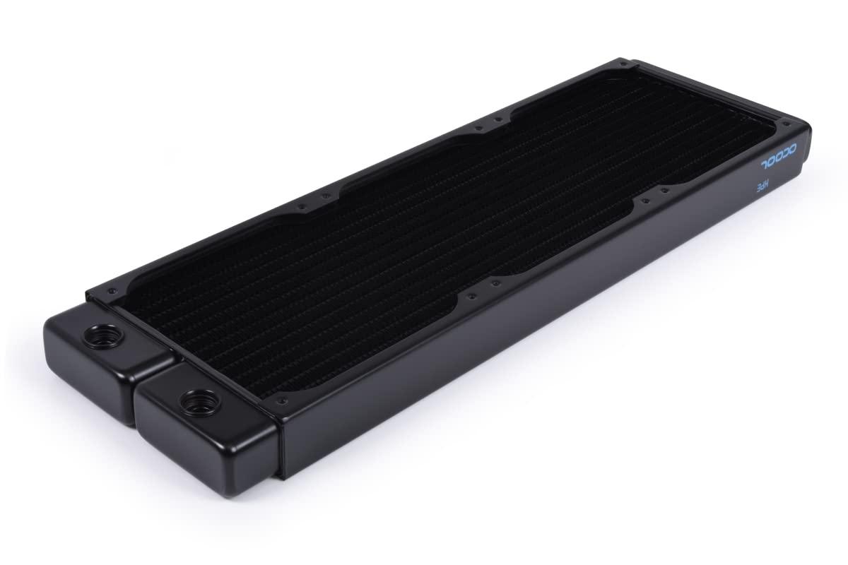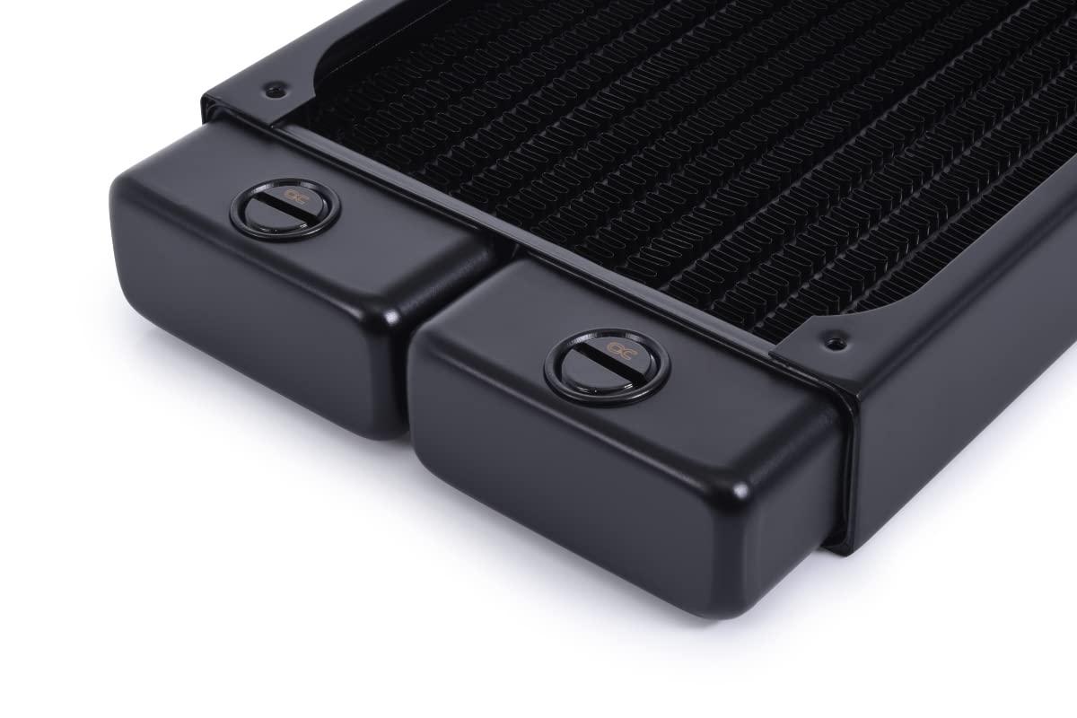 - Specifiche tecniche del radiatore (lunghezza x larghezza x altezza): 391,5 x 124 x 30 mm (+/-3%). Materiale: pinne di raffreddamento, pre-camere e canali di raffreddamento, rame, materiale filettato, ottone, materiale esterno in acciaio inox, attacchi 4 x G1/4" IN/OUT e 1 porta di scarico G1/4" (max. 5 mm di lunghezza della filettatura: 120 mm. Possibile occupazione della ventola: 3 x un lato/6 x su entrambi i lati. Dimensioni filettatura M3. Pressione testata 0,8 Bar.