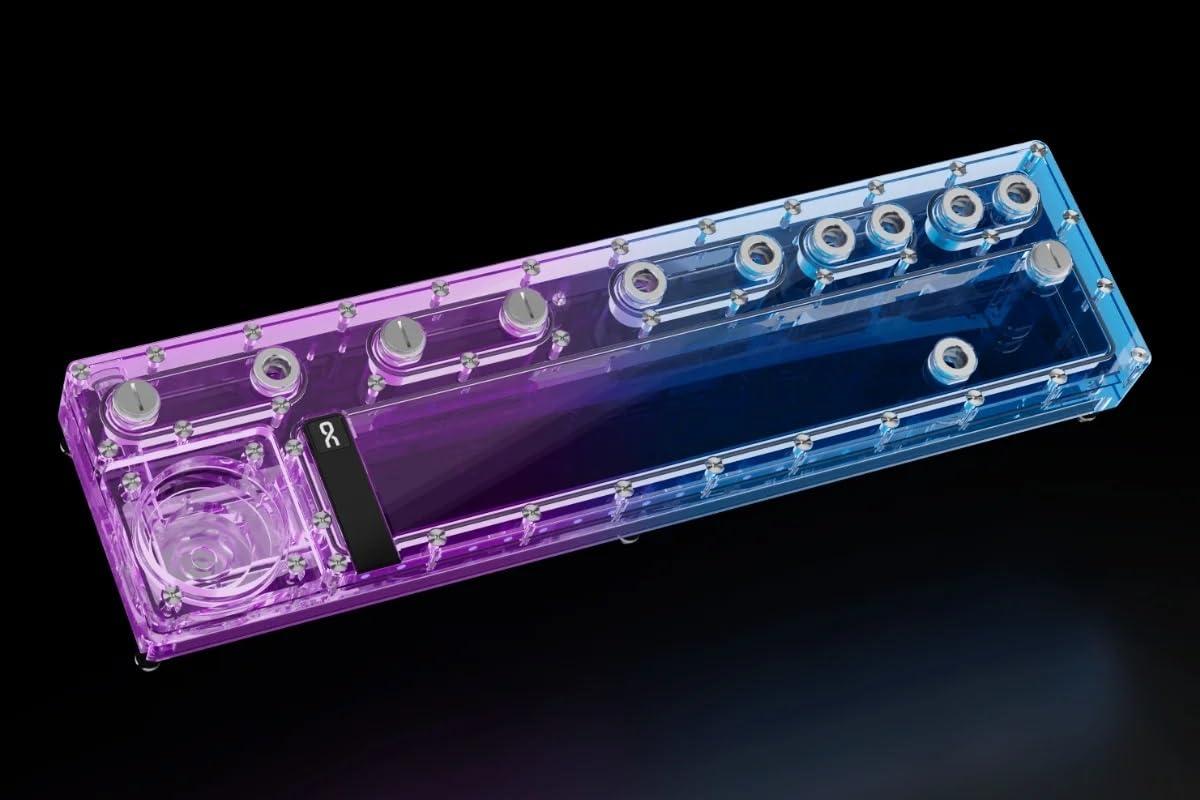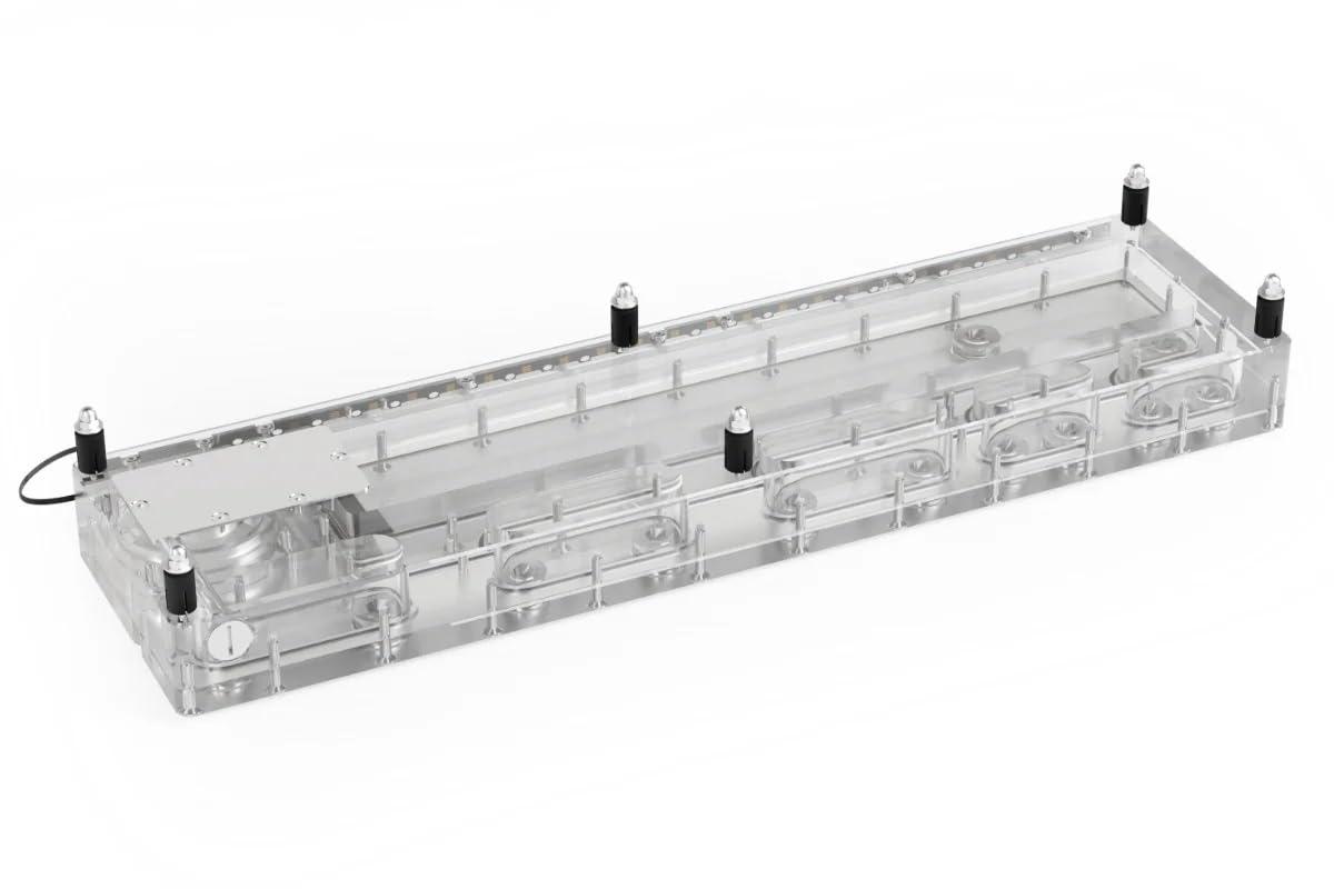 La piastra Alphacool Core Distro è un must assoluto per tutti i sistemi di raffreddamento ad acqua personalizzati! Con il suo design centrale, non è solo un vero e proprio colpo d'occhio, ma anche un capolavoro funzionale che semplifica la costruzione e la pianificazione di complessi anelli d'acqua e offre un'installazione semplice. La piastra Distro è realizzata in acrilico di alta qualità e dotata di connessioni in ottone cromato G1/4'. Questi sono stati incassati e volutamente non avvitati per ridurre al minimo il rischio di crepe e perdite aumentando la stabilità. I collegamenti sono costituiti da due parti, hanno un O-ring e si contrappongono quando montati in acrilico. Ciò non solo garantisce l'assoluta tenuta di ogni connettore, ma consente anche l'aspetto pulito e funzionale della serie Core Design di Alphacool. La disposizione delle connessioni è progettata non solo per ottimizzare il routing dei tubi, ma anche per fornire un aspetto attraente. Questo è completato dalla sua illuminazione aRGB integrata, che fornisce effetti visivi impressionanti. L'illuminazione può essere controllata tramite un header aRGB digitale sulla scheda madre o opzionalmente tramite il controller Alphacool Aurora Eiscontrol aRGB (articolo n. : 15360). Il kit di montaggio Alphacool Core Push è incluso nella fornitura, il che semplifica notevolmente l'installazione della piastra di distribuzione. I perni metallici sono fissati a un radiatore o al pannello del case del PC e le maniche femmina corrispondenti sono attaccate alla piastra di distribuzione in modo da doverle solo spingere sui perni. Questo sistema garantisce un montaggio sicuro della piastra di distribuzione e consente un facile smontaggio per manutenzione o estensioni. Una descrizione dettagliata si trova nelle istruzioni allegate. Dati tecniciDimensioni (L x P x A)480,00 x 125,00 x 42,00 mmDimensioni (L x P x A) con pompa480,00 x 125,00 x 61,00 mmDimensioni (L x P x A) con montaggio a spinta480,00 x 122,00 mm 5,00 x 72,80 mmDimensioni (L x P x A) con pompa + montaggio a spinta480,00 x 125,00 x 88,80 mmMa