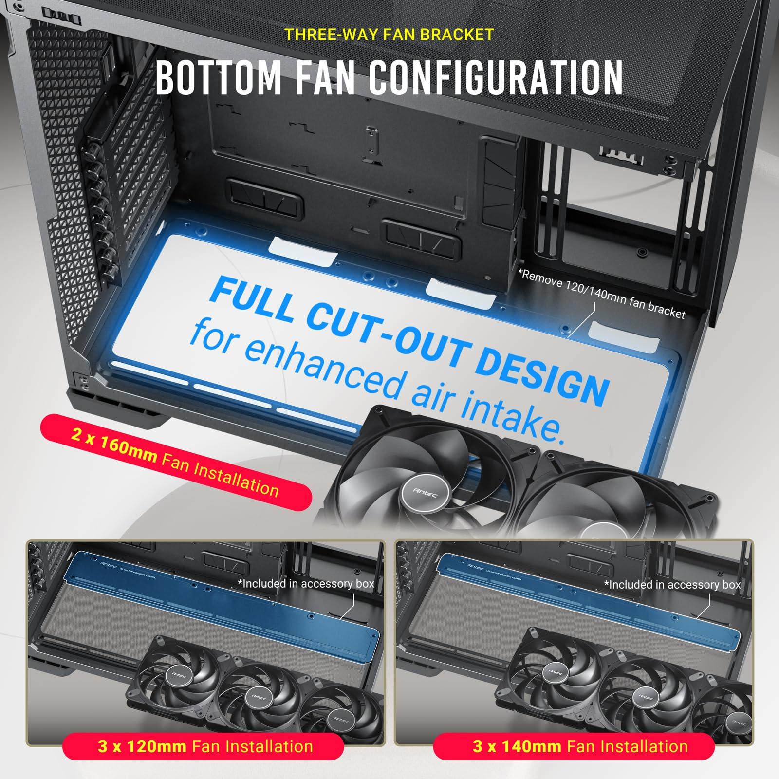 - Taglio completo nella parte inferiore con supporti per ventola intercambiabili da 120 mm/140 mm.