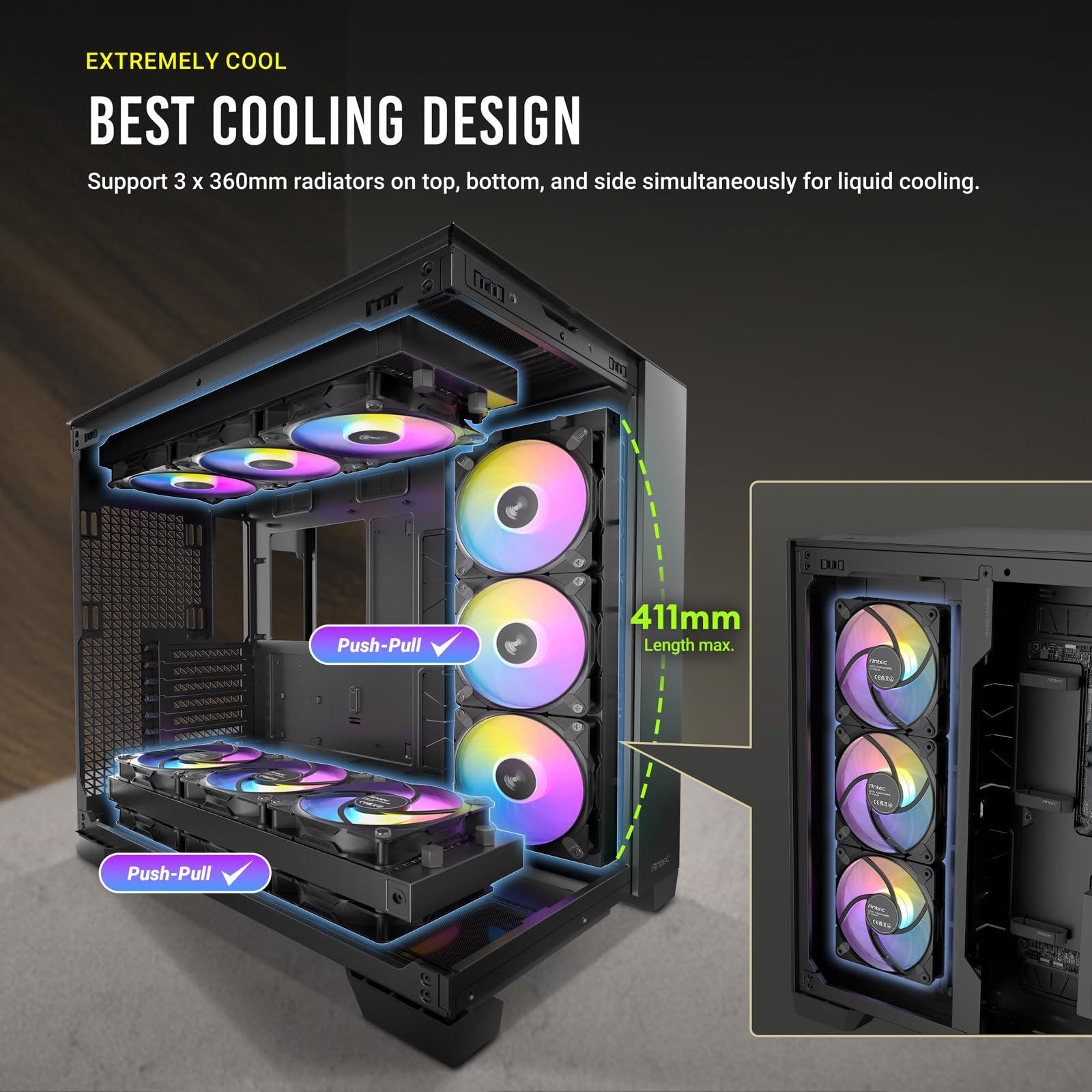 - Supporta radiatori spessi da 360 mm sulla parte superiore, inferiore e laterale contemporaneamente.