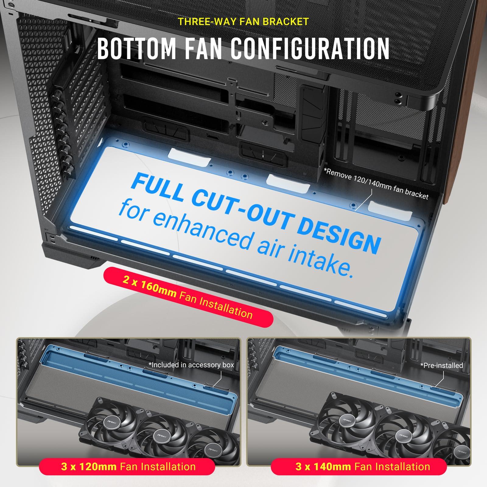 - Taglio completo nella parte inferiore con supporti per ventola intercambiabili da 120 mm/140 mm.