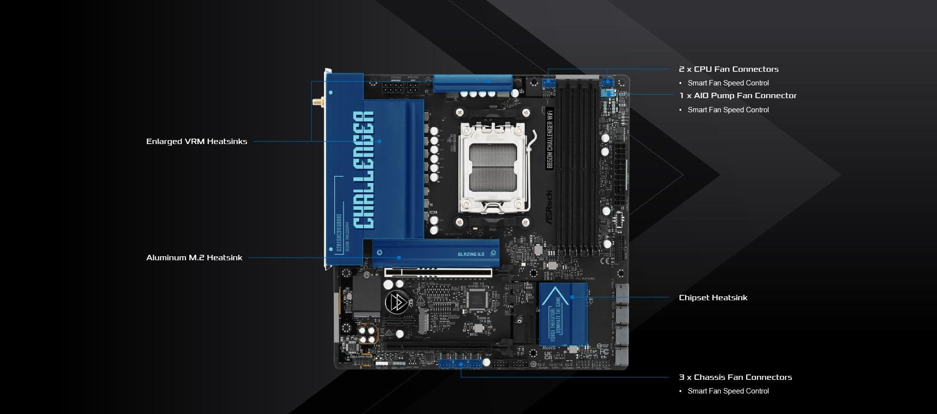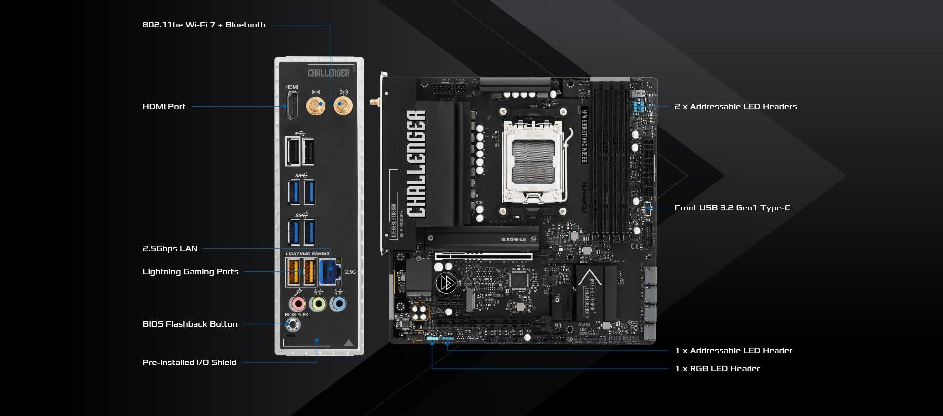 La ASRock B850M Challenger WiFi è una scheda madre Micro-ATX progettata per i giocatori che richiedono prestazioni senza paura, caratteristiche audaci ed evoluzione incessante. Basato sulla piattaforma AMD AM5, supporta i processori Ryzen serie 9000, 8000 e 7000 con un robusto design di potenza 8+1+1 fase, garantendo una stabilità solida durante sessioni di gioco estese. Grazie al supporto di memoria DDR5 ad alta velocità fino a 8000+(OC) su quattro slot DIMM, questa scheda offre le prestazioni reattive necessarie per i giochi moderni e il multitasking. Questa scheda madre è dotata di una tecnologia all'avanguardia e incentrata sui giocatori. È dotato dell'ultimo WiFi 7 per una connettività wireless ultraveloce e porte Lightning Gaming dedicate che riducono al minimo il ritardo di ingresso, offrendoti un vantaggio competitivo. Lo slot PCIe 5.0 x16 e il socket Blazing M.2 sono a prova di futuro della tua build per grafica e archiviazione di nuova generazione, mentre il software Dragon 2.5G LAN dà priorità al traffico di rete in modo intelligente per un gioco online fluido. Nahimic Audio migliora il codec Realtek ALC897, fornendo un audio posizionale coinvolgente. Progettato per un'evoluzione incessante, B850M Challenger WiFi combina una pratica espandibilità, tra cui slot PCIe aggiuntivi, storage M.2 e porte SATA, con strumenti intuitivi come BIOS Flashback e Auto Driver Installer. È la base ideale per costruire un potente impianto di gioco pronto per il futuro che sfrutta la più recente tecnologia wireless senza compromettere prestazioni o funzionalità.