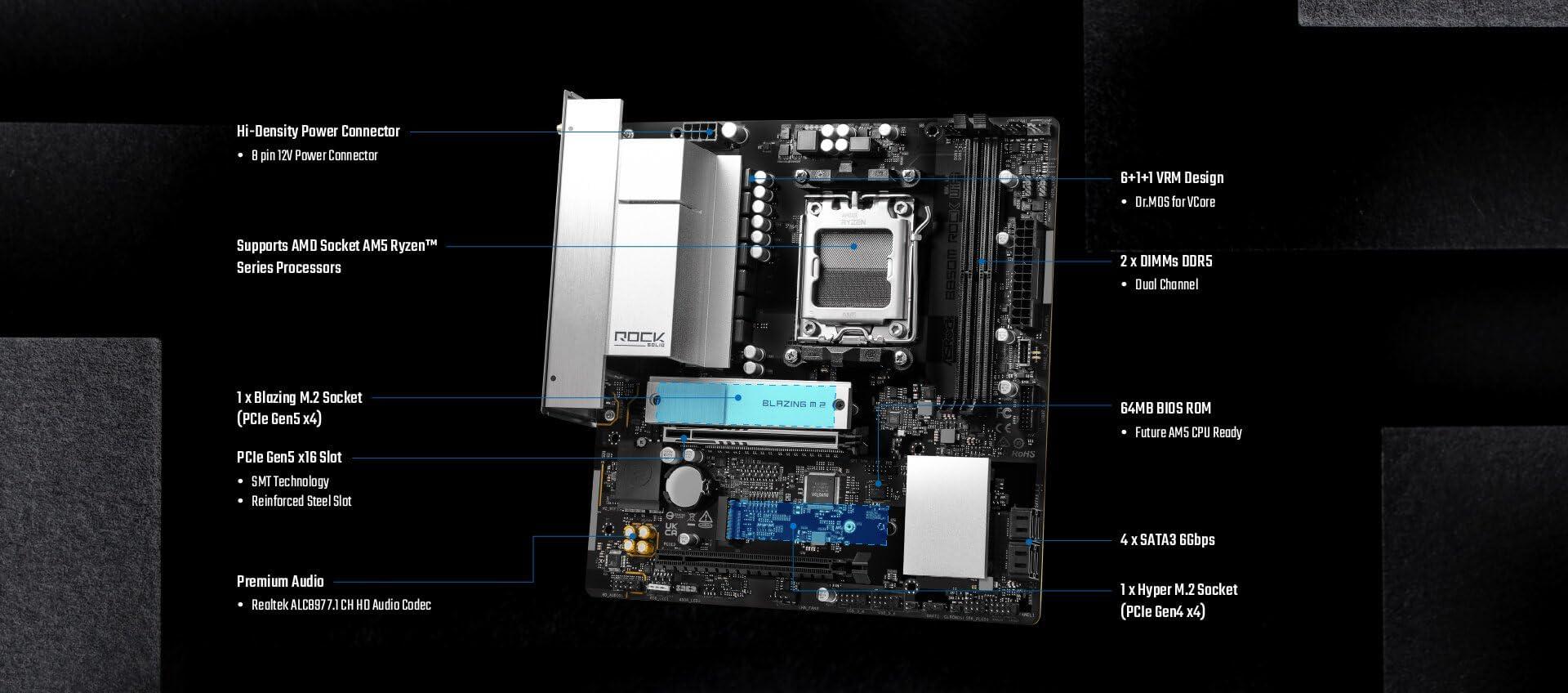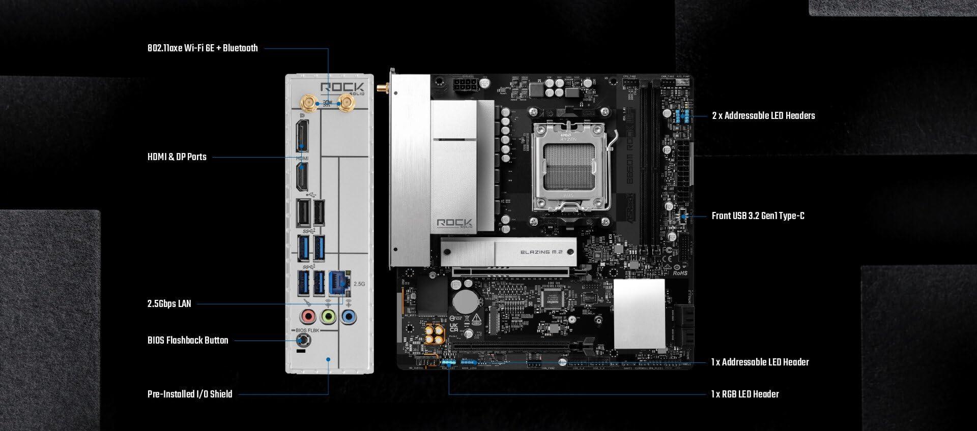 ASRock B850M Rock WiFi - Motherboard - micro ATX - Socket AM5 - AMD B850 Chipsatz - USB-C 3.2 Gen 1, USB 3.2 Gen 1 - 2.5 Gigabit LAN, Bluetooth, Wi-Fi 6E - Onboard-Grafik (CPU erforderlich)