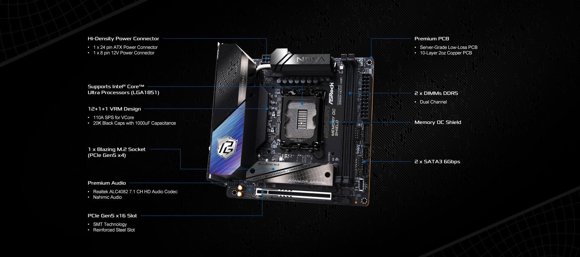 ASRock Intel Core Ultra Z890 LGA1851 RL-ILM Mini ITX Scheda Madre Phantom Gaming Z890i Nova WiFi 7 DDR5 9466 MHz 128 GB