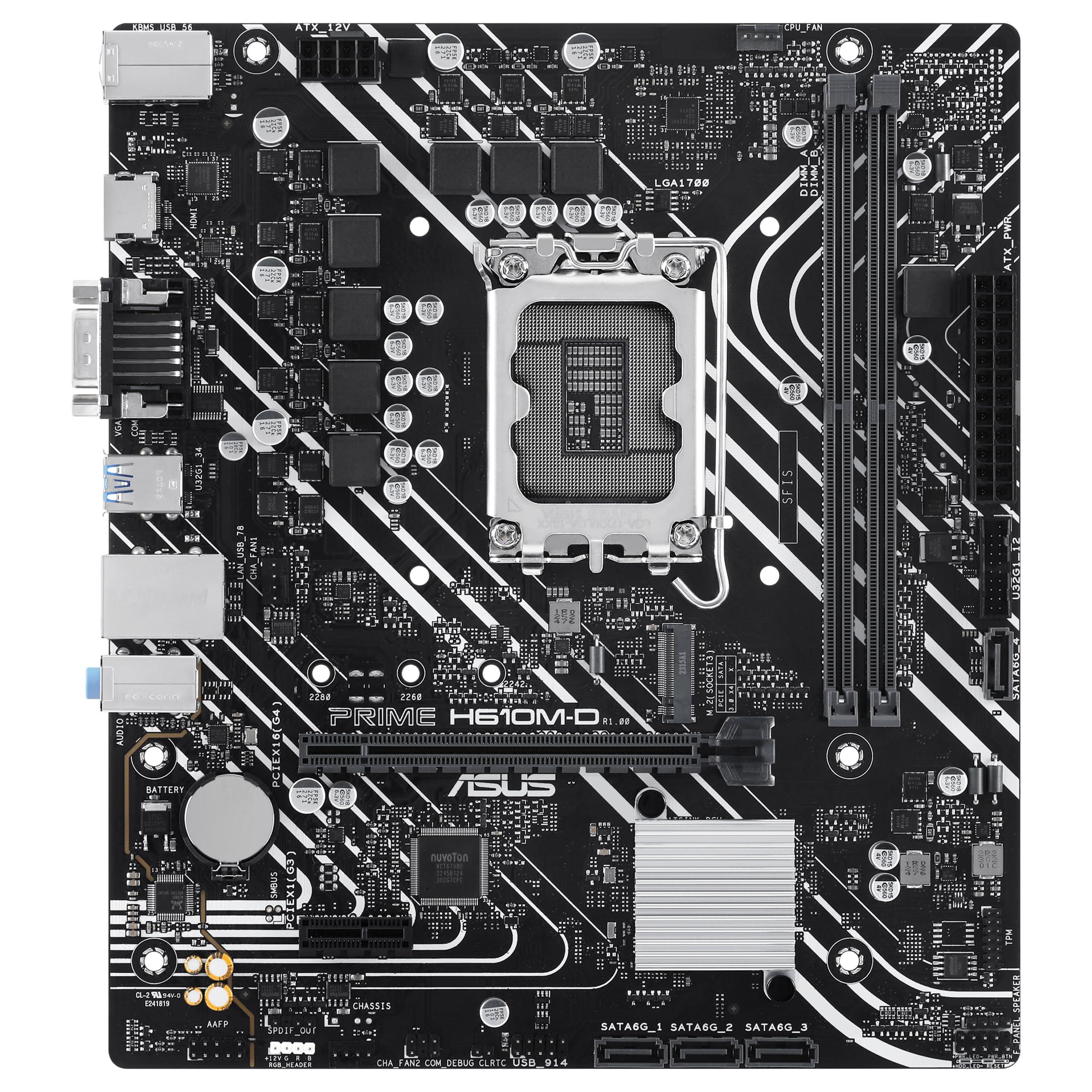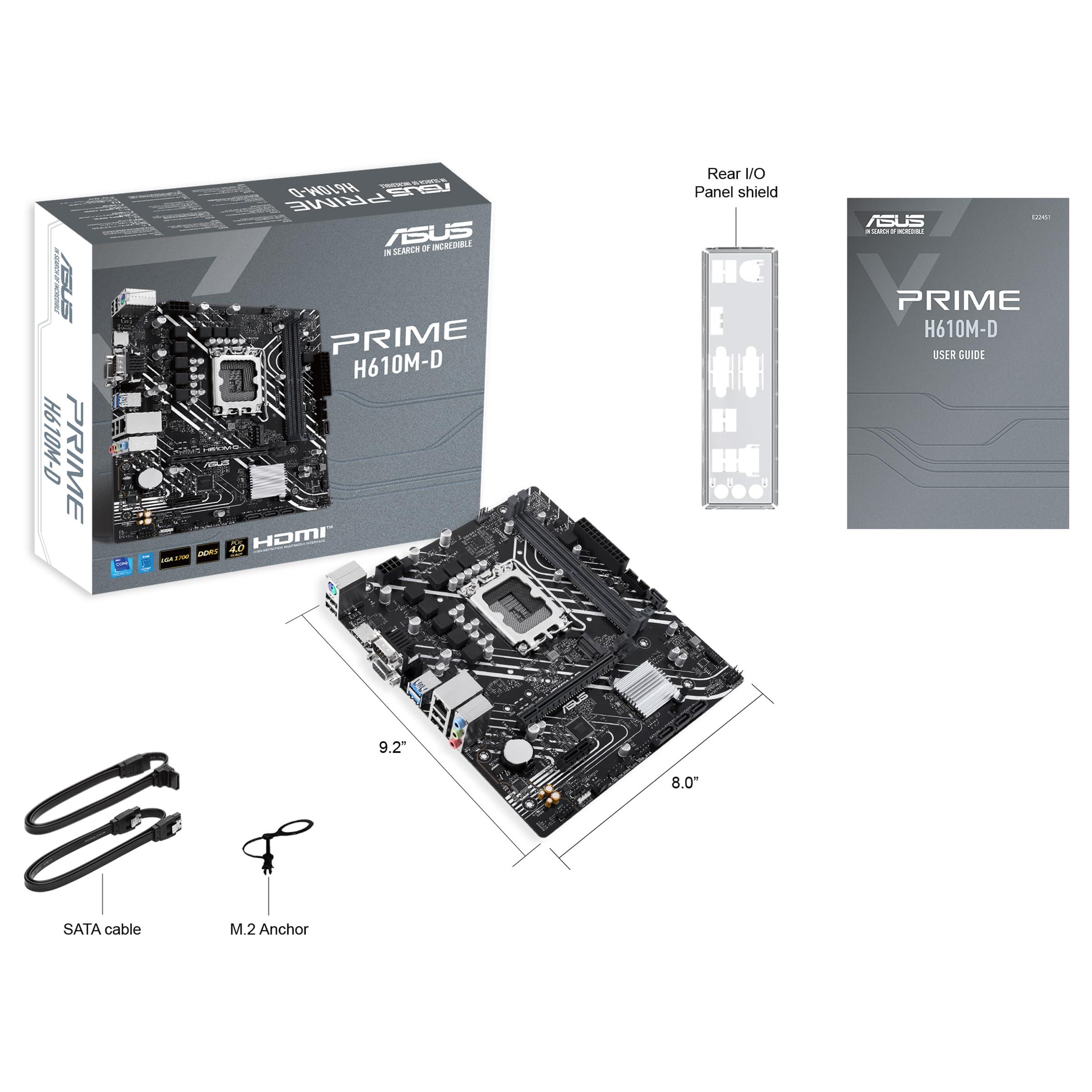 ASUS PRIME H610M-D Scheda Madre mATX Intel H610 (LGA 1700), DDR5, PCIe 4.0, slot M.2, Realtek 1 Gb Ethernet, HDMI, VGA, USB 3.2 Gen 1, SATA 6 Gbps, Header RGB
