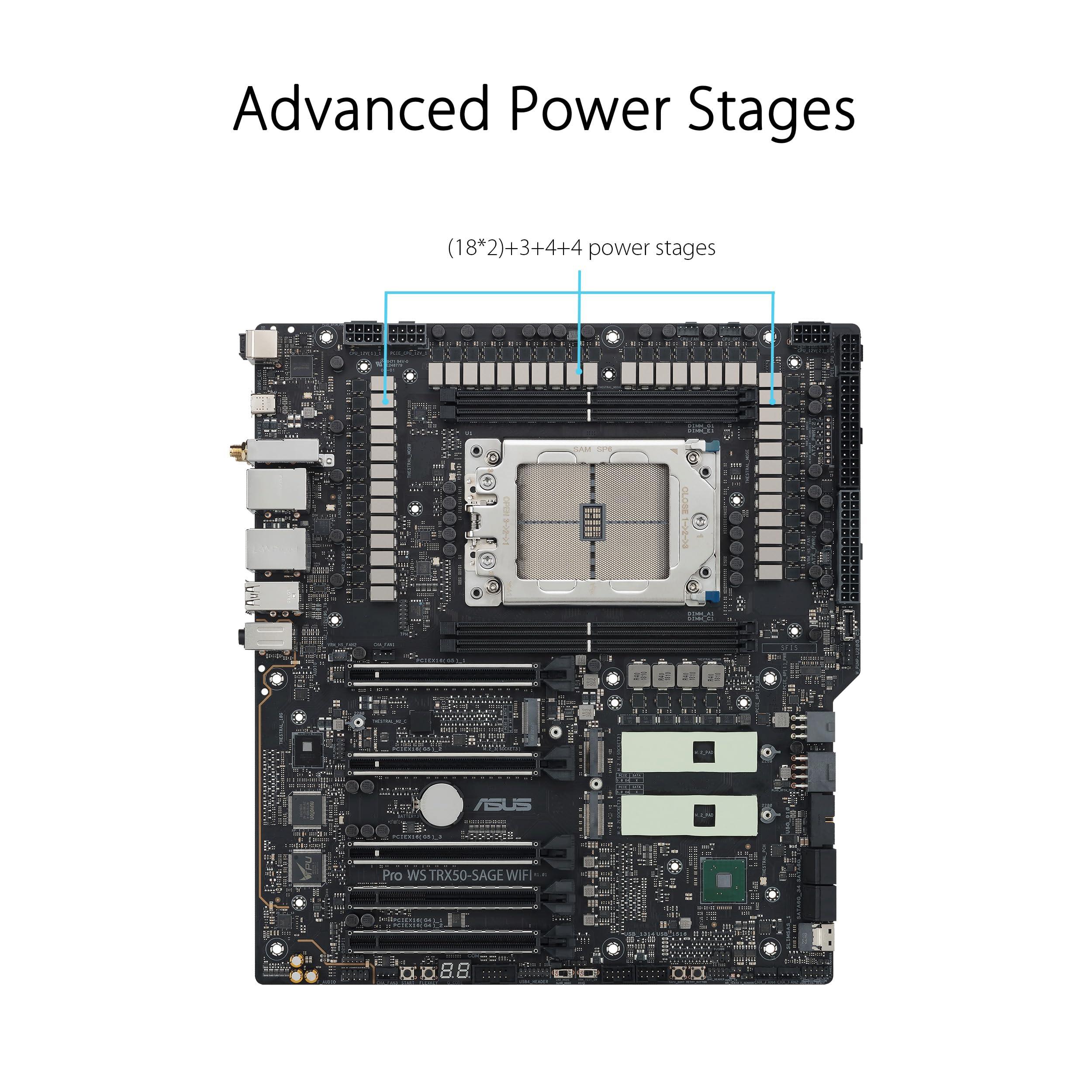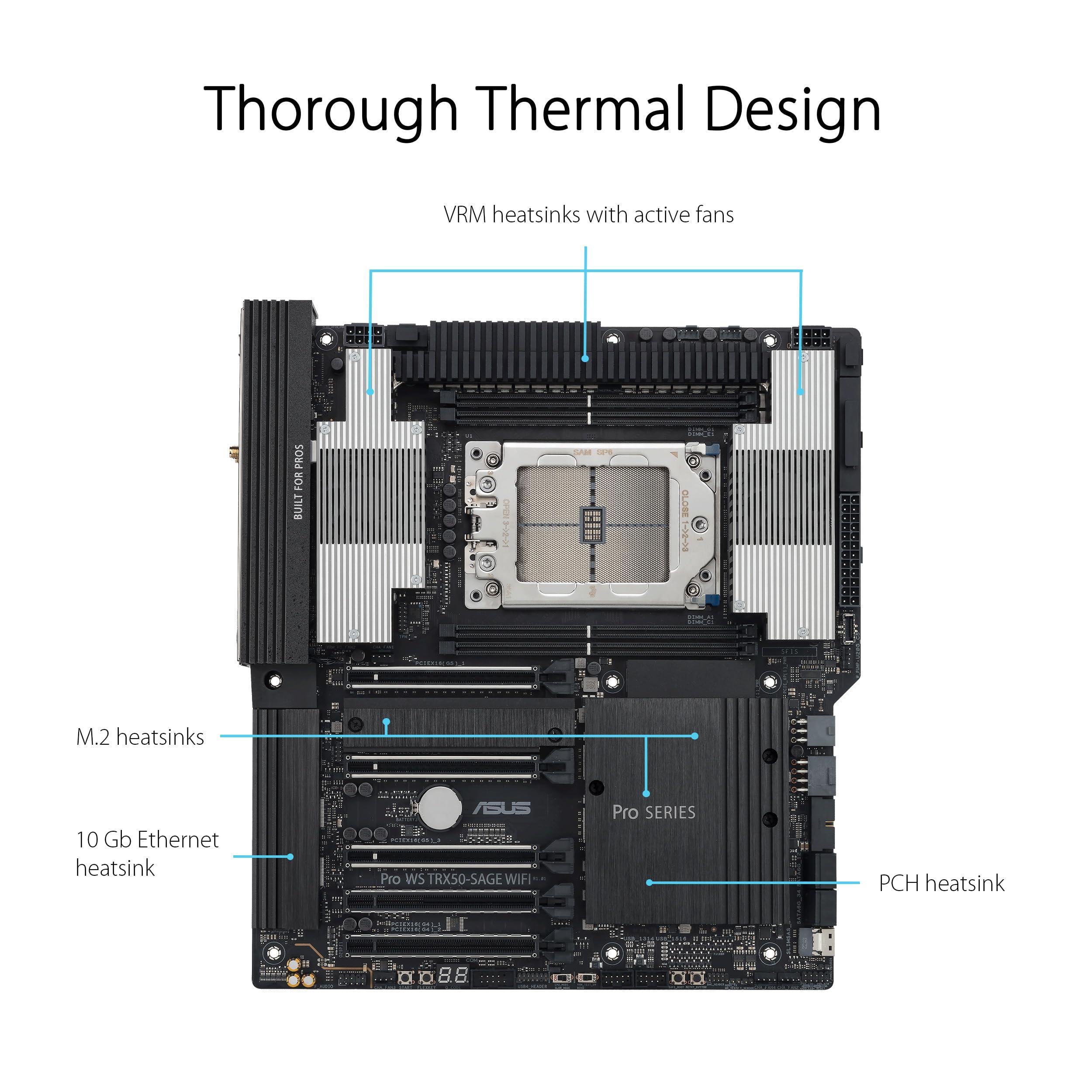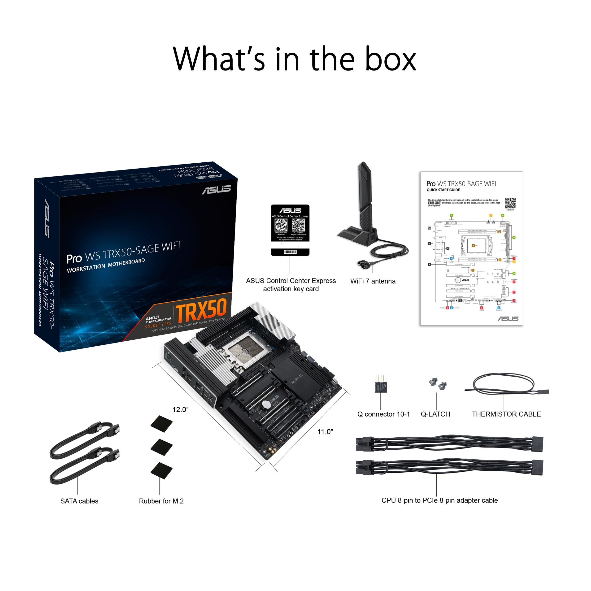ASUS PRO WS TRX50-SAGE WIFI A, Scheda Madre AMD, Socket AMD sTR5 per CPU fino a 96 Core, 36 Stadi di Alimentazione, Slot DDR5 ECC R-DIMM, Tre Slot M.2, Tre slot PCIe 5.0, USB-C 20 Gbps, Nera