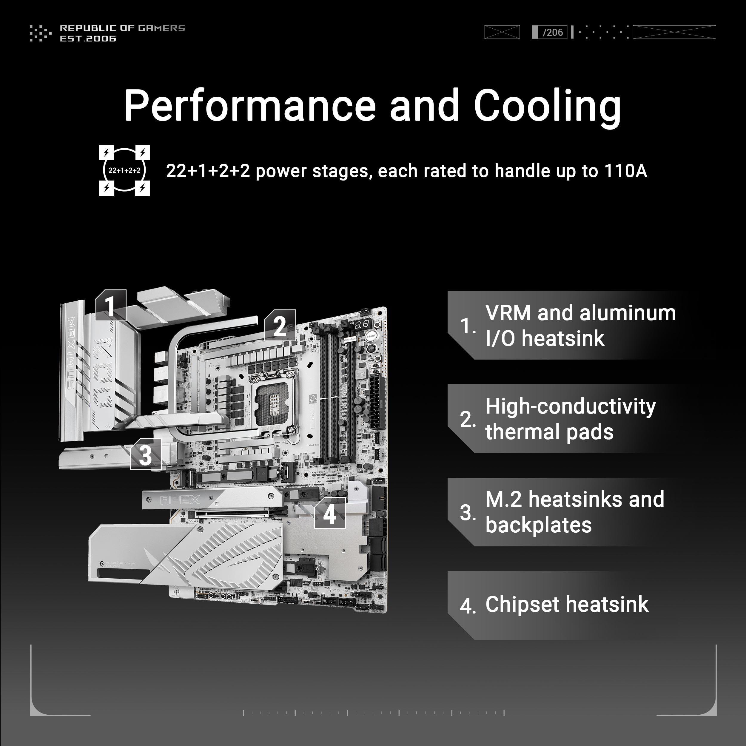 - Design termico ottimizzato: Dissipatori massicci con copertura I/O integrata, pad termici ad alta conduttività e collegati con heatpipe