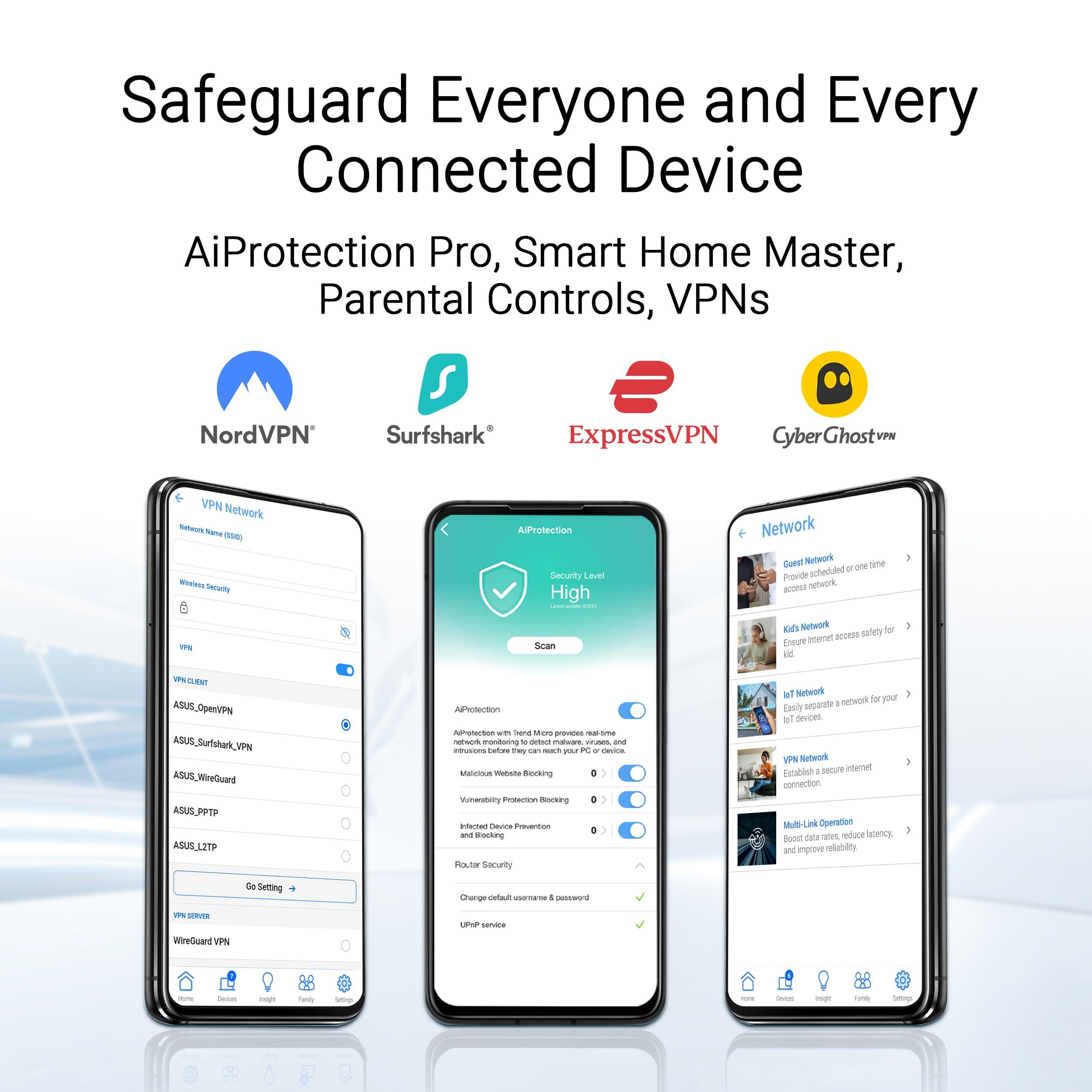 - Stabilite fino a tre SSID per i dispositivi IoT, e sfruttate al meglio la protezione AiProtection Pro, il Parental Control e VPN, grazie alla rete Smart Home Master