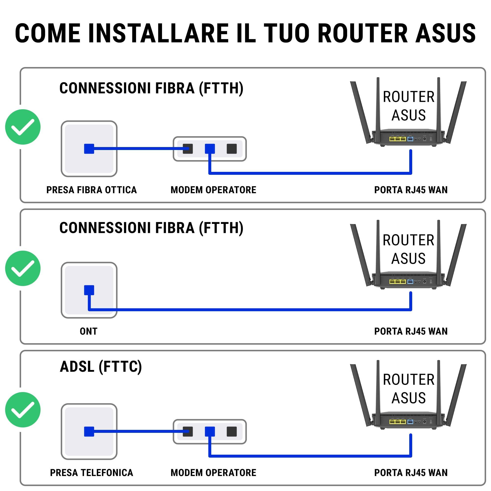 - !!!ATTENZIONE!!!: Questo è un Router e non è un Modem; è compatibile con FTTC, FTTH (fibra-rame) se collegato al modem o all’ONT dell’operatore; è compatibile con ADSL, EVDSL se collegato al modem dell’operatore; non compatibile con Cavi RJ11; non ha porte VOIP