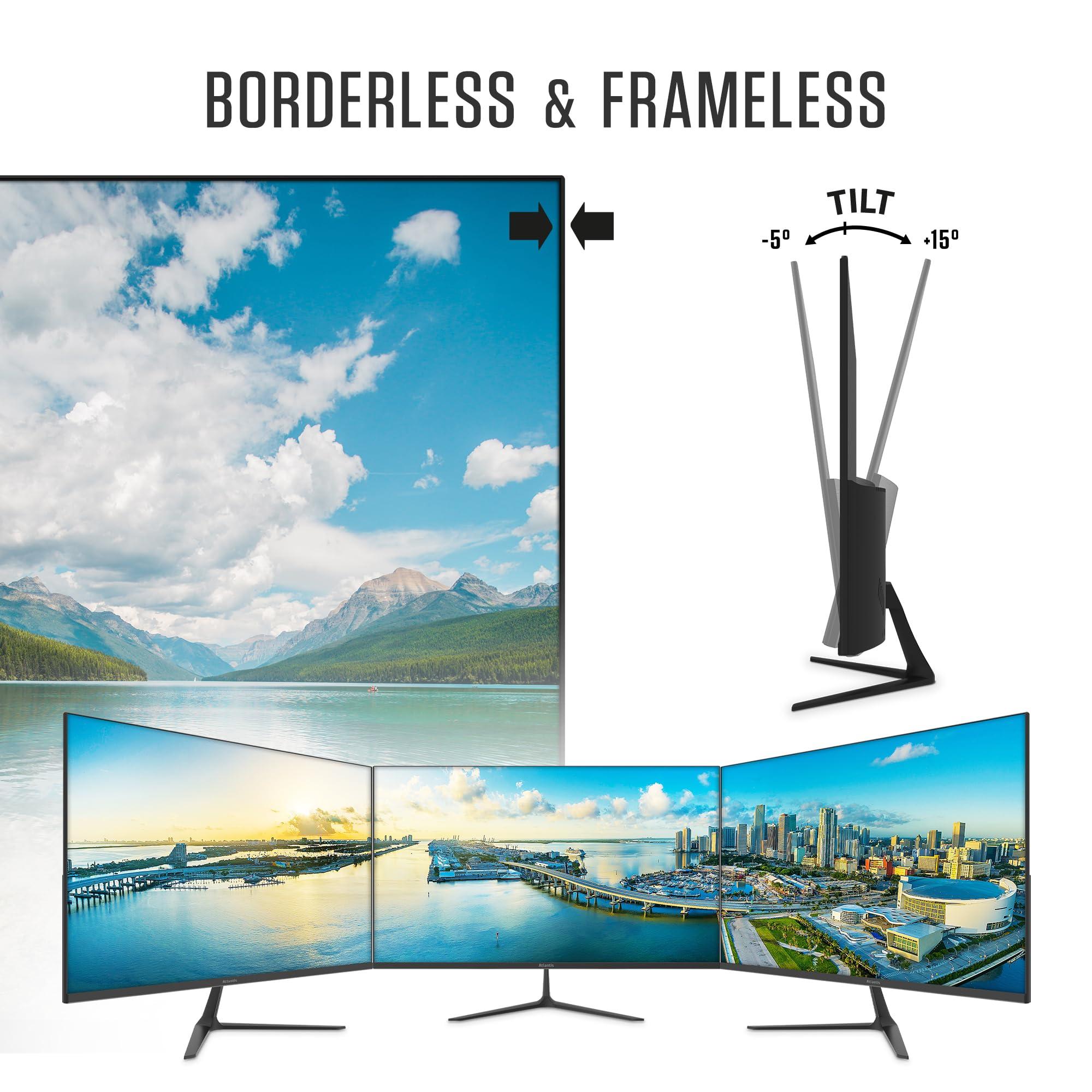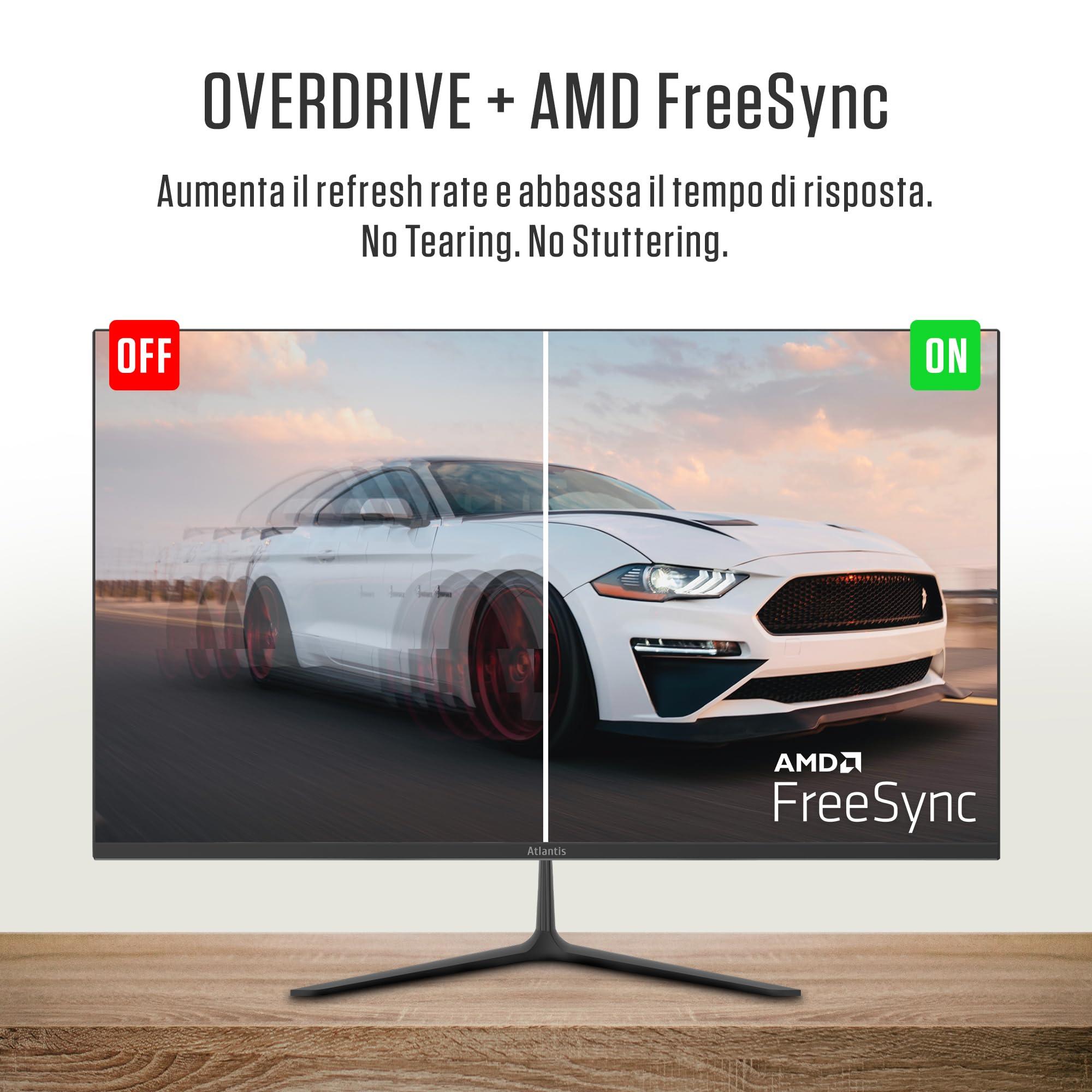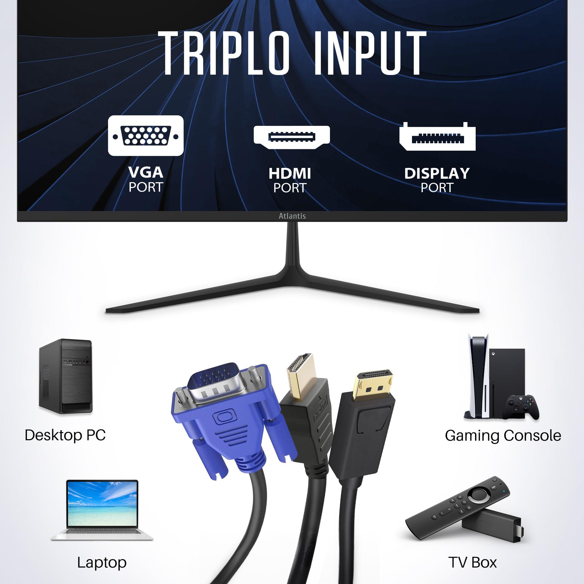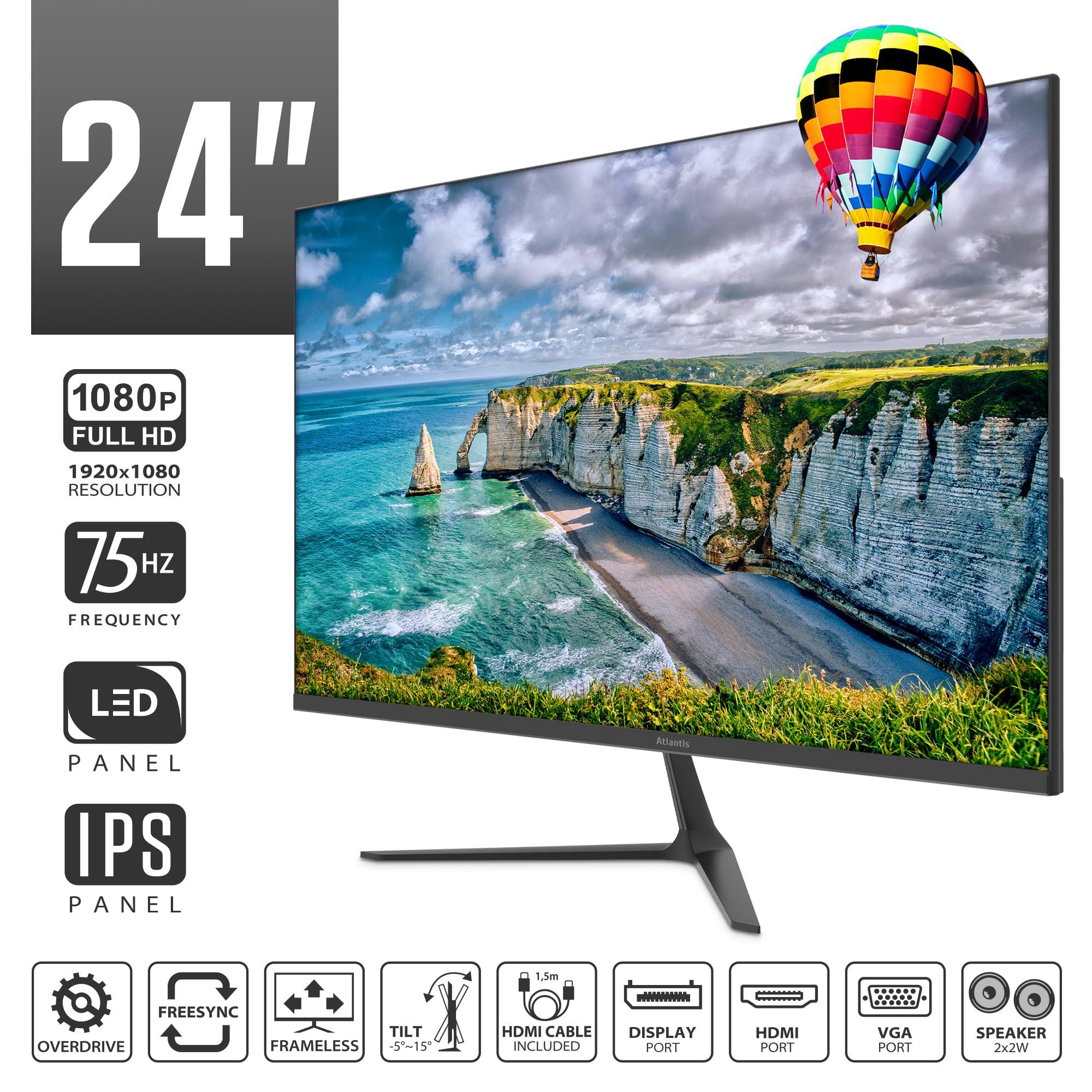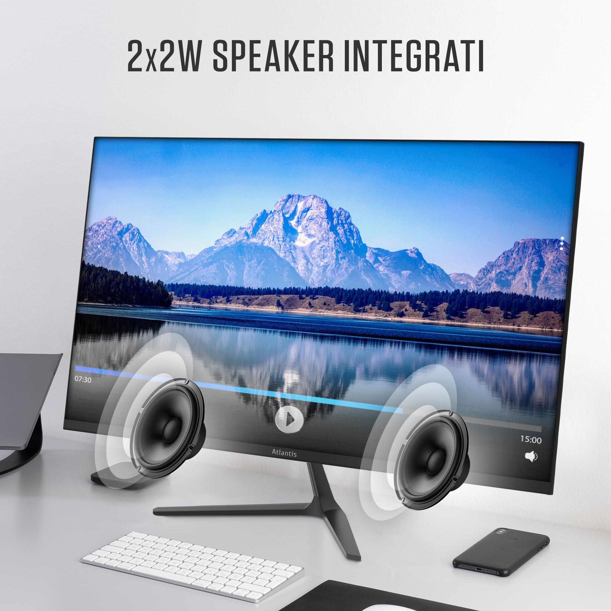 Atlantis Monitor 24 pollici, schermo 24" IPS 75Hz, Full HD 1920x1080, VGA HDMI DP, MULTIMEDIALE, FreeSync, Uscita Audio/Cuffie, inclin, risposta 5ms, Contrasto 1000:1, Angolo 178/178, Cavo HDMI 1,5m