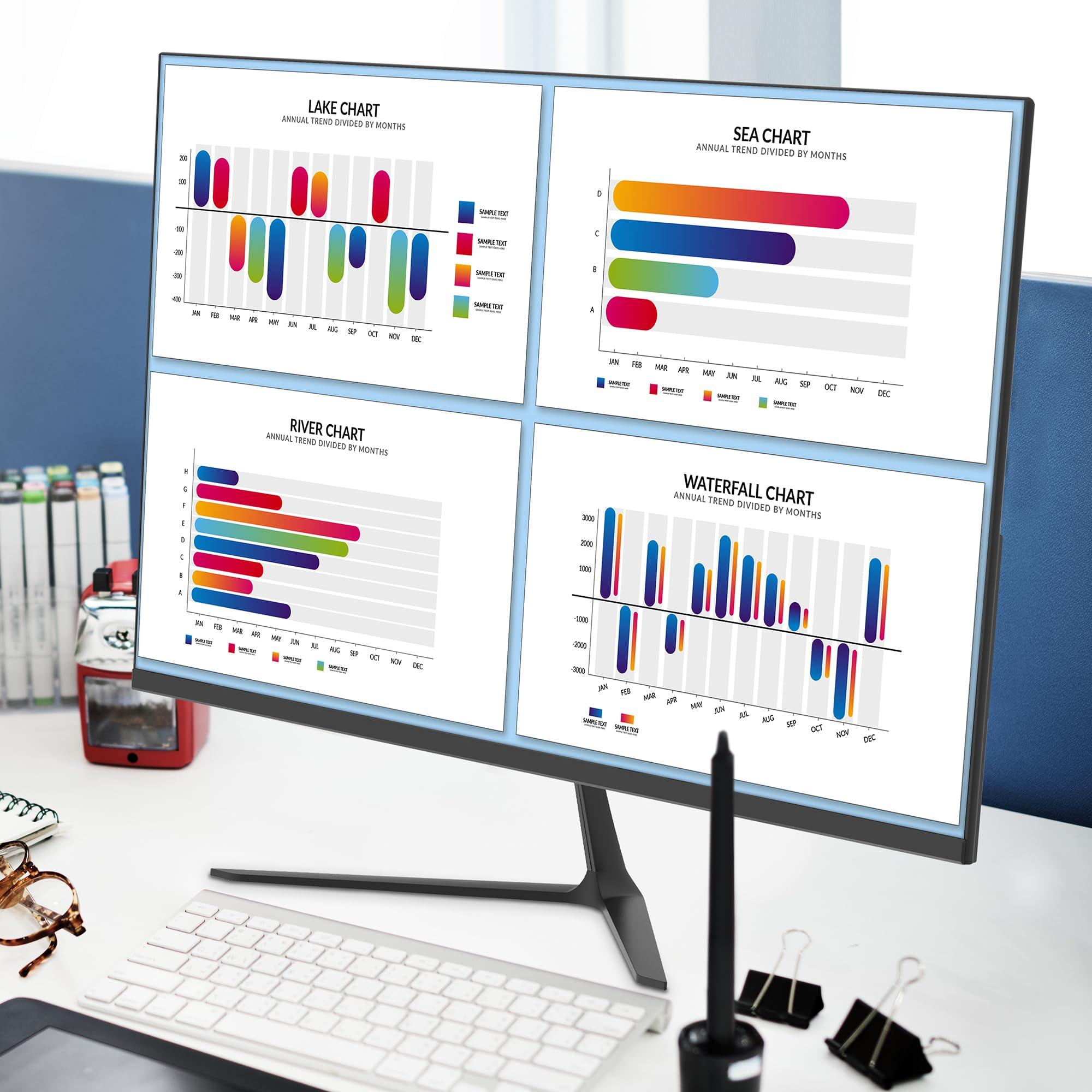 - [1] - Monitor 24" (23.8") con tecnologia IPS e risoluzione 1920x1080 (FHD) // Frequenza di aggiornamento a 75Hz, il pannello riproduce 75 fotogrammi al secondo (il 25% in più di quanto riprodotto dalla maggior parte dei normali pannelli in commercio).