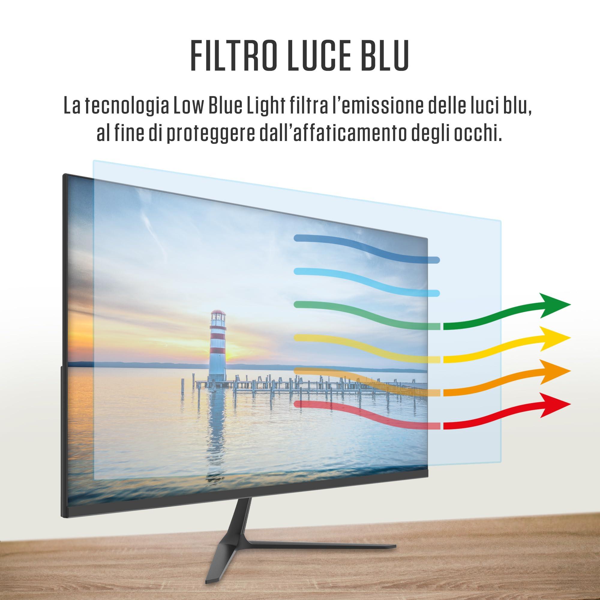 - [4] - Frameless & Borderless: Il design senza cornice (frameless) consente configurazioni multi-monitor senza soluzione di continuità // Blue Light Filter: Il filtro per la luce blu riduce le emissioni di luce blu, senza alterare i colori dello schermo (efficace per protegge i vostri occhi e i vostri dati). L’uso di una speciale tecnologia LED capace di spostare il picco di lunghezza d'onda dai dannosi 450nm ai più sicuri 460nm, permette la riduzione della luce blu di oltre il 90%.