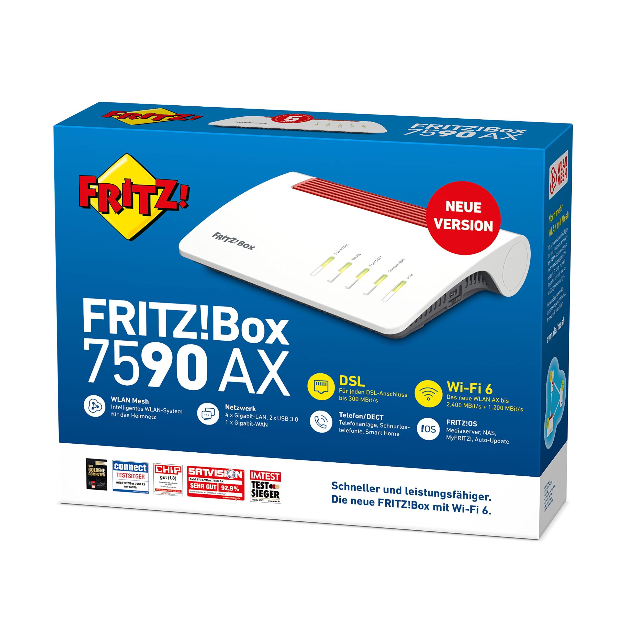 AVM FRITZ!Box 7590 AX (router Wi-Fi 6 con 2.400 Mbit/s (5 GHz) e 1.200 Mbit/s (2,4 GHz), fino a 300 Mbit/s con VDSL-SSupervectoring 35 b,rete Wi-Fi, base DECT, versione in lingua tedesca)
