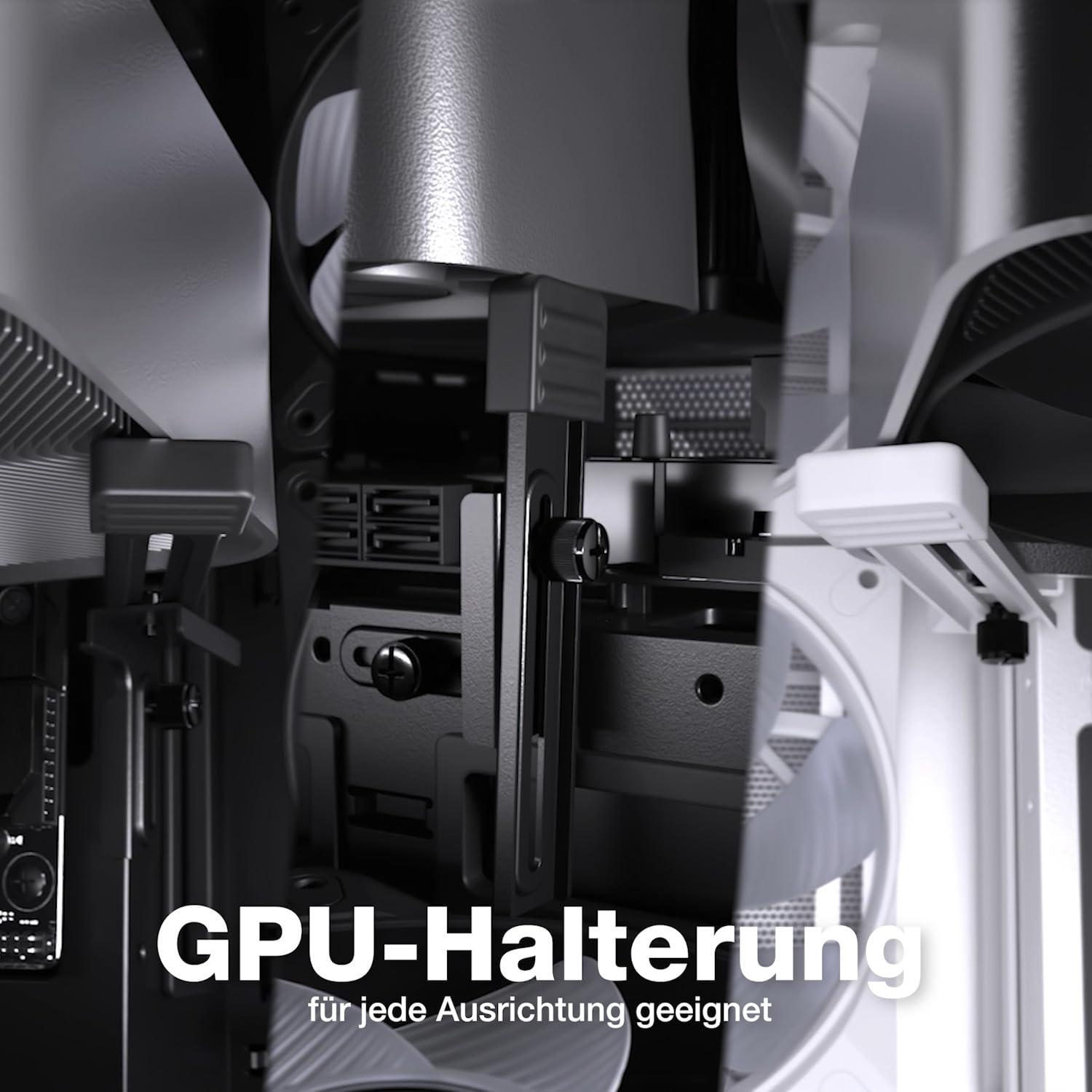 - Light Base 600 DX White viene fornito con un supporto flessibile per schede grafiche che impedisce sottilmente la tua scheda grafica di affondare. La parte migliore: il supporto della scheda video funziona in tutte le direzioni, sia con GPU installate orizzontalmente che verticalmente. Così il tuo sistema apparirà in ordine anche con l'hardware più pesante.