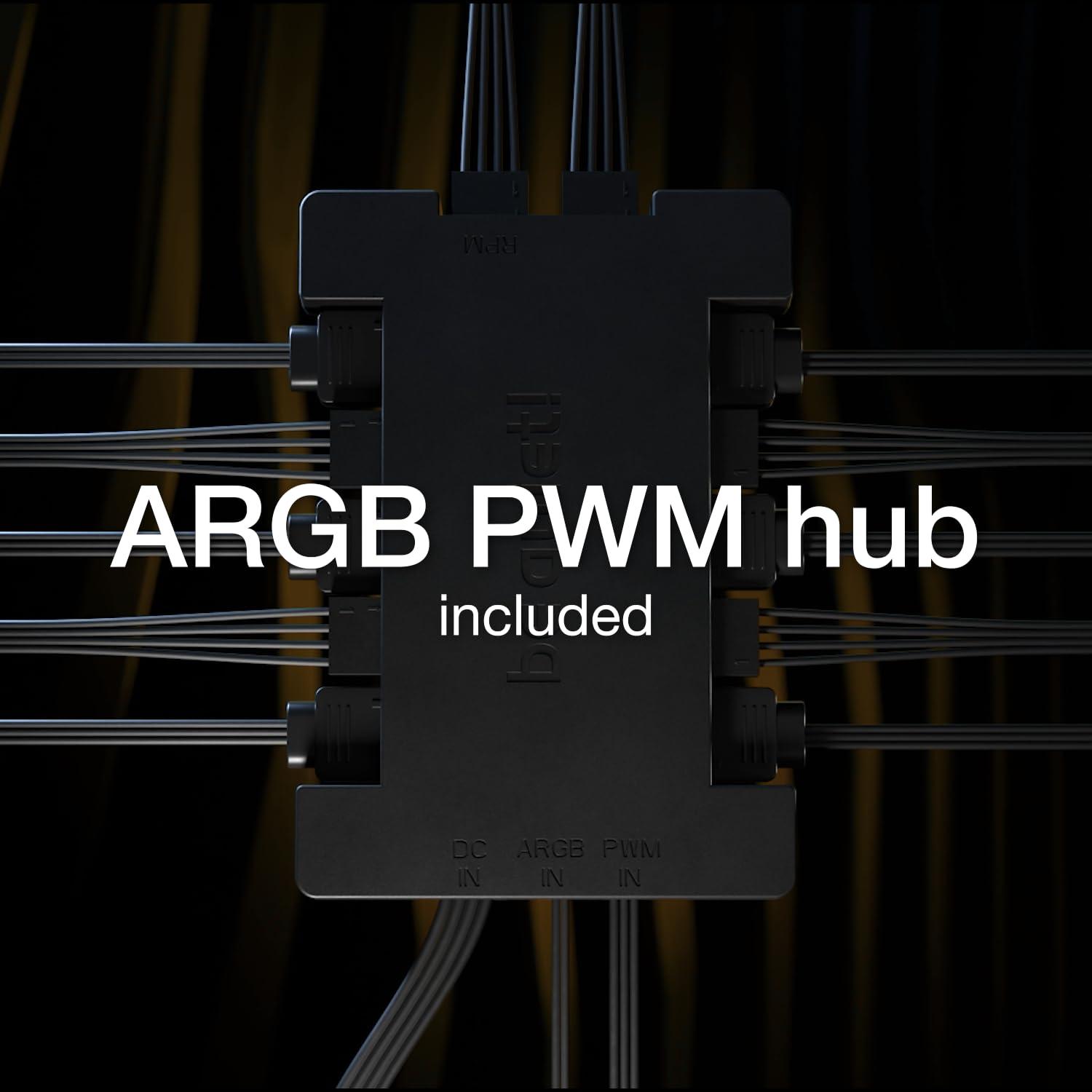 - L’hub ARGB-PWM permette di sincronizzare fino a 6 ventole PWM e 6 componenti ARGB. Ciò vi permetterà di gestire tutto il raffreddamento e l’illuminazione con un solo header PWM ed un solo header ARGB sulla vostra scheda madre. Il controller può essere posizionato ovunque nel case grazie al nastro biadesivo incluso o a fori per viti che corrispondono a quelli di un SSD da 2.5”.