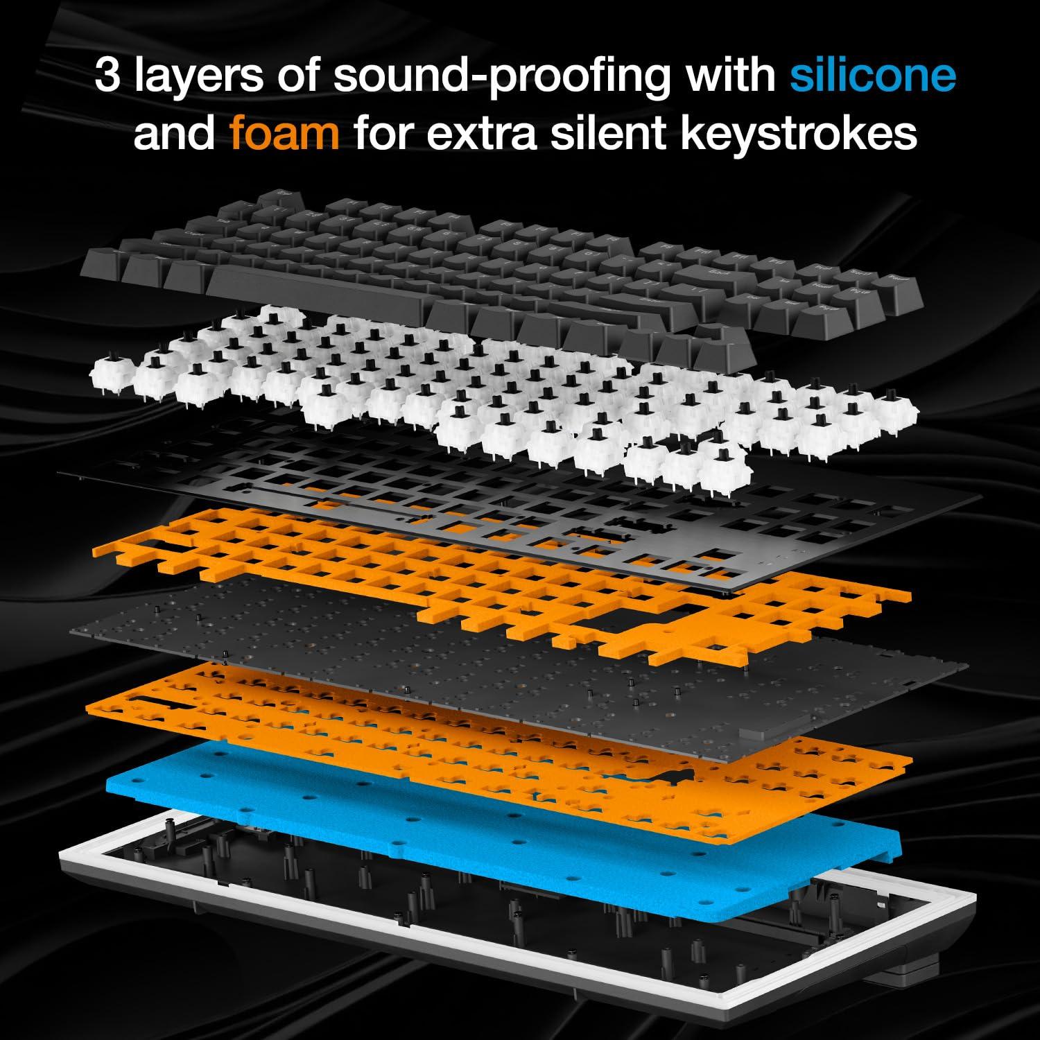 - Ogni pressione di tasto è precisa, fa clic immediatamente – e rimane silenziosa. I nostri switch tattili neri sono pre-lubrificati per ridurre al minimo l'attrito e il rumore. Un involucro in nylon PA66 e un perno in POM garantiscono una sensazione di digitazione delicata con un chiaro punto di attivazione. Anche gli stabilizzatori sotto tasti grandi come la barra spaziatrice o l'invio sono lubrificati e inoltre imbottiti nel punto di contatto del PCB per la massima riduzione del rumore. Tutti gli interruttori sono sostituibili a caldo e possono essere sostituiti individualmente con interruttori MX a 5 poli.