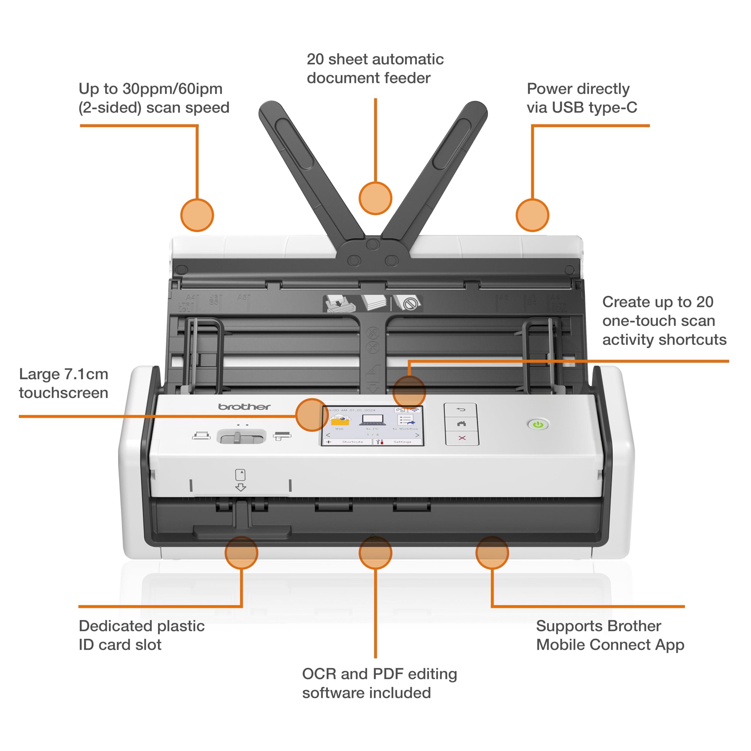 Brother ADS1800W - Scanner per documenti portatile, ADF da 20 fogli, slot per carte d'identità, touchscreen, app di supporto, software OCR e PDF incluso | Spina del Regno Unito