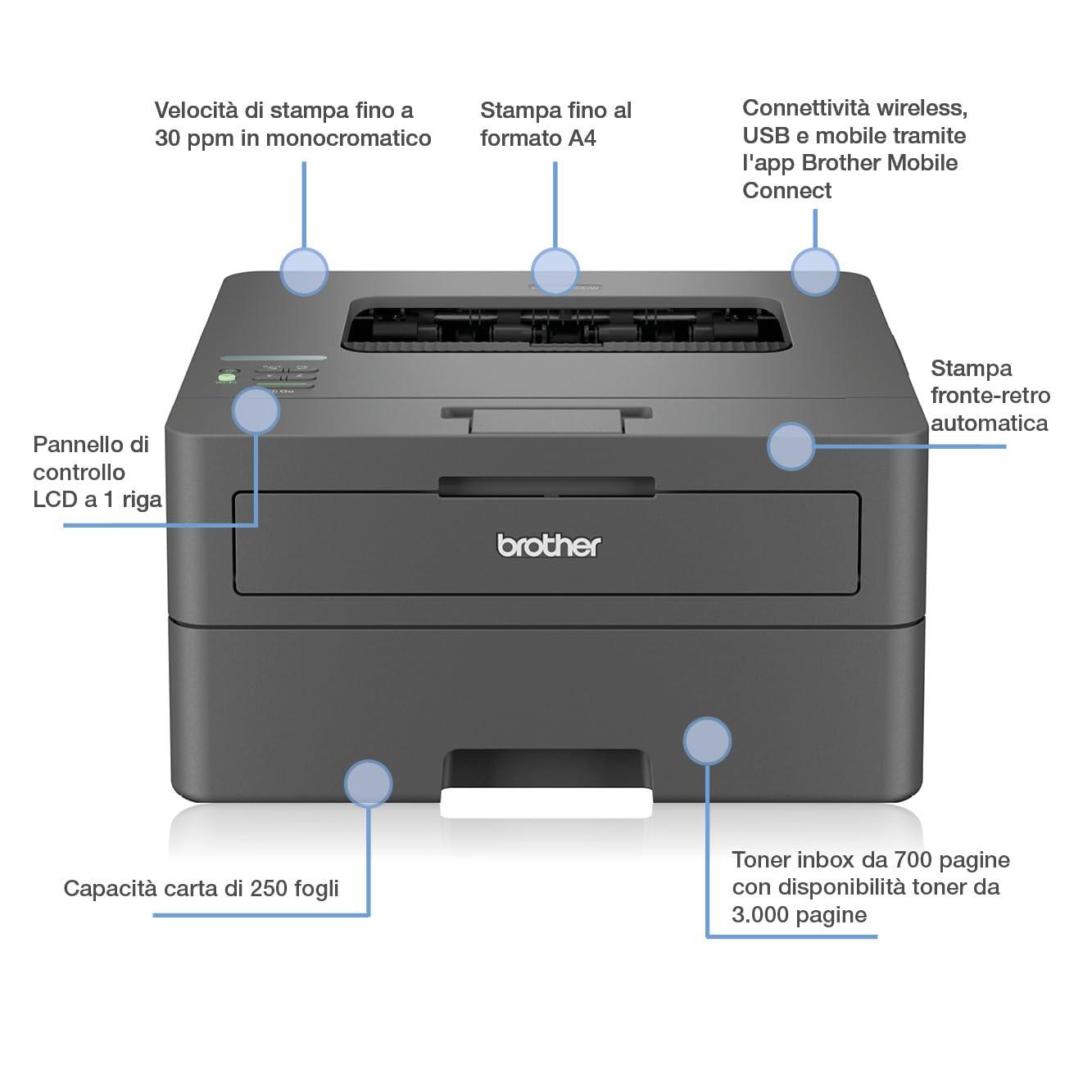 Brother HLL2400DWE Stampante Ecopro ready| 30 ppm|Stampa Fronte/Retro|Display LCD|Wireless (NO LAN)|Cassetto carta da 250 fogli| Inbox Toner fino a circa 700 pagine