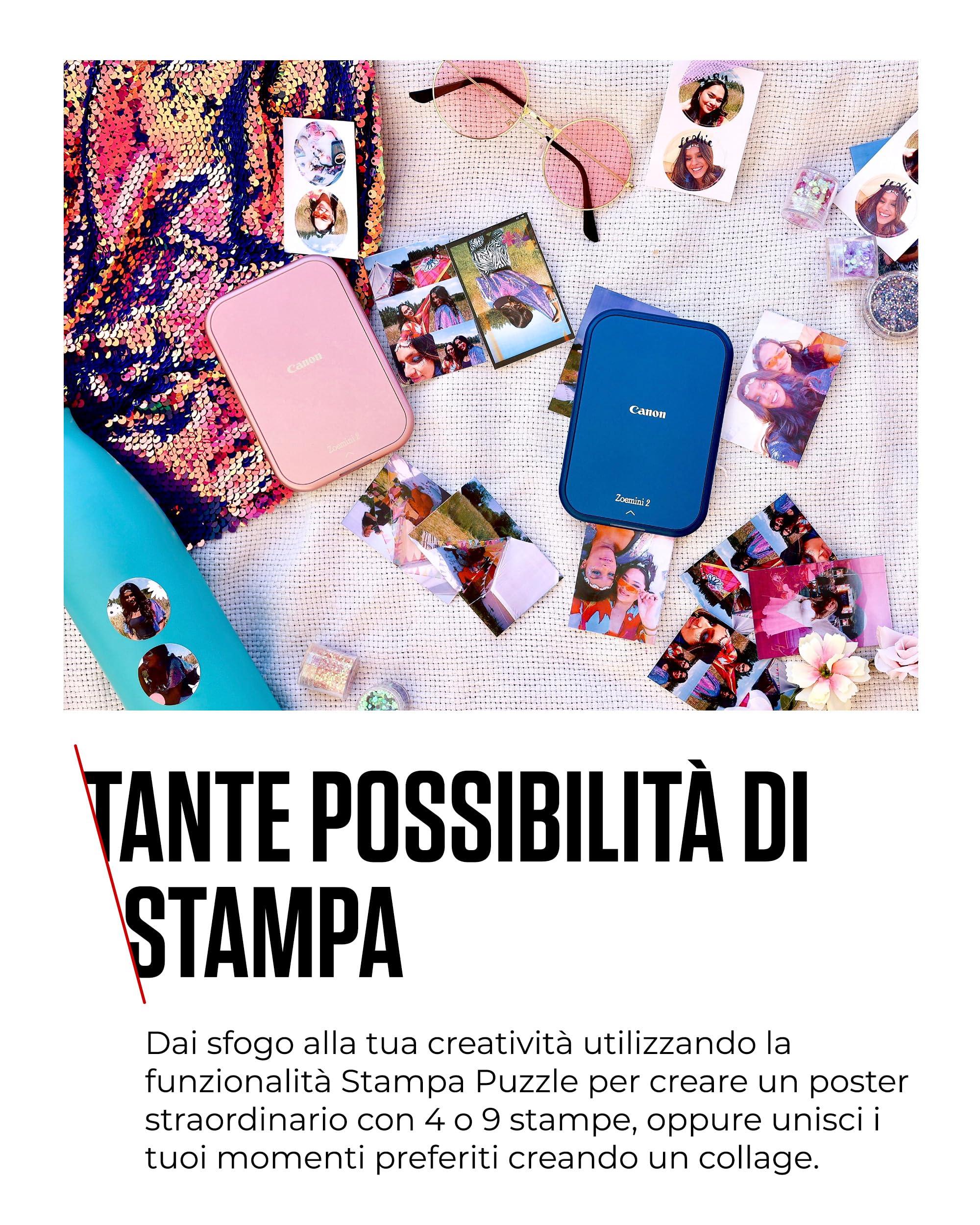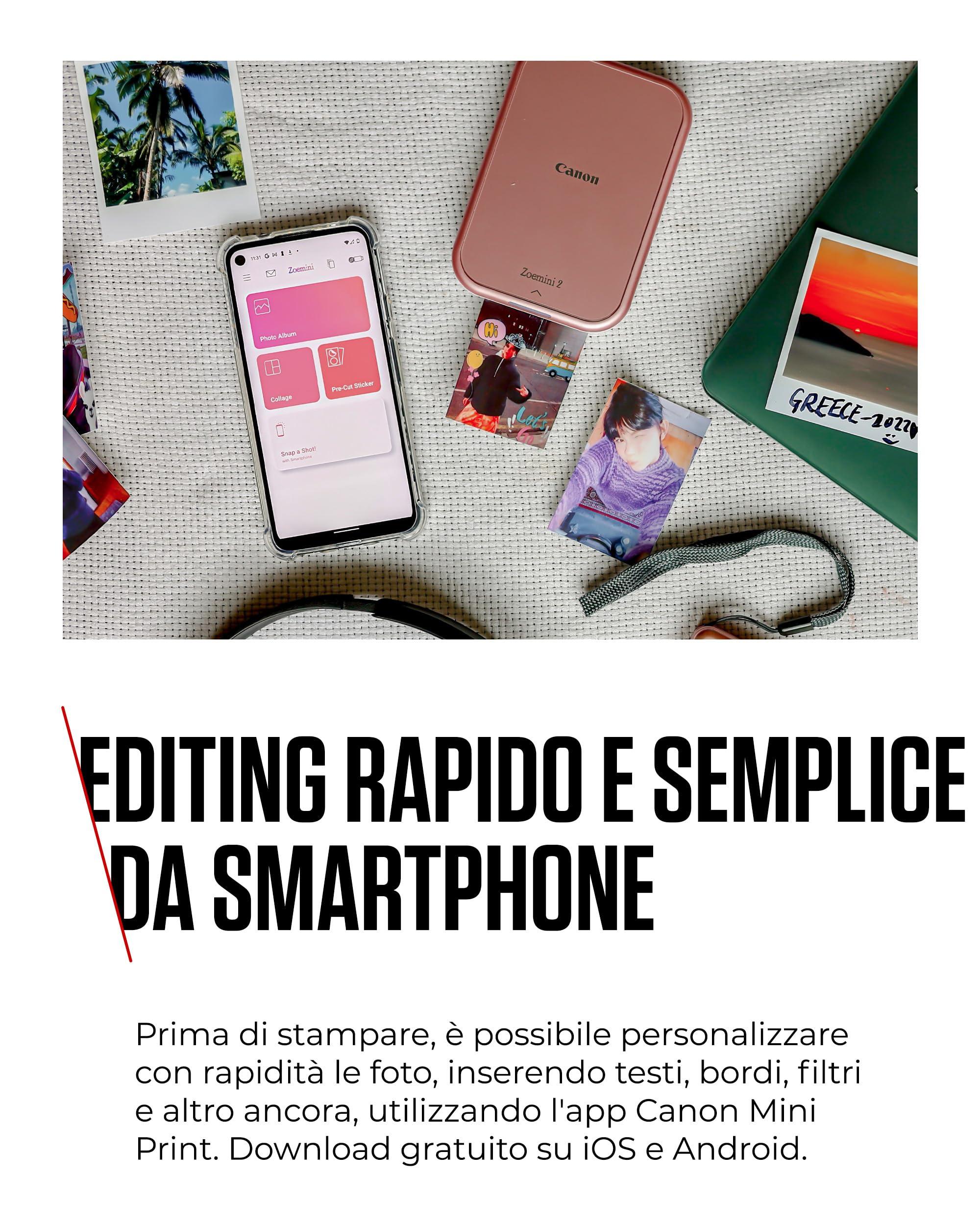- LE TUE FOTO A MODO TUO: sfrutta l'app Canon Mini Print con questa stampante per fotografie compatta Canon, e scopri un mondo di creatività. Con stampe adesive e collage, i tuoi ricordi si muovono con te.