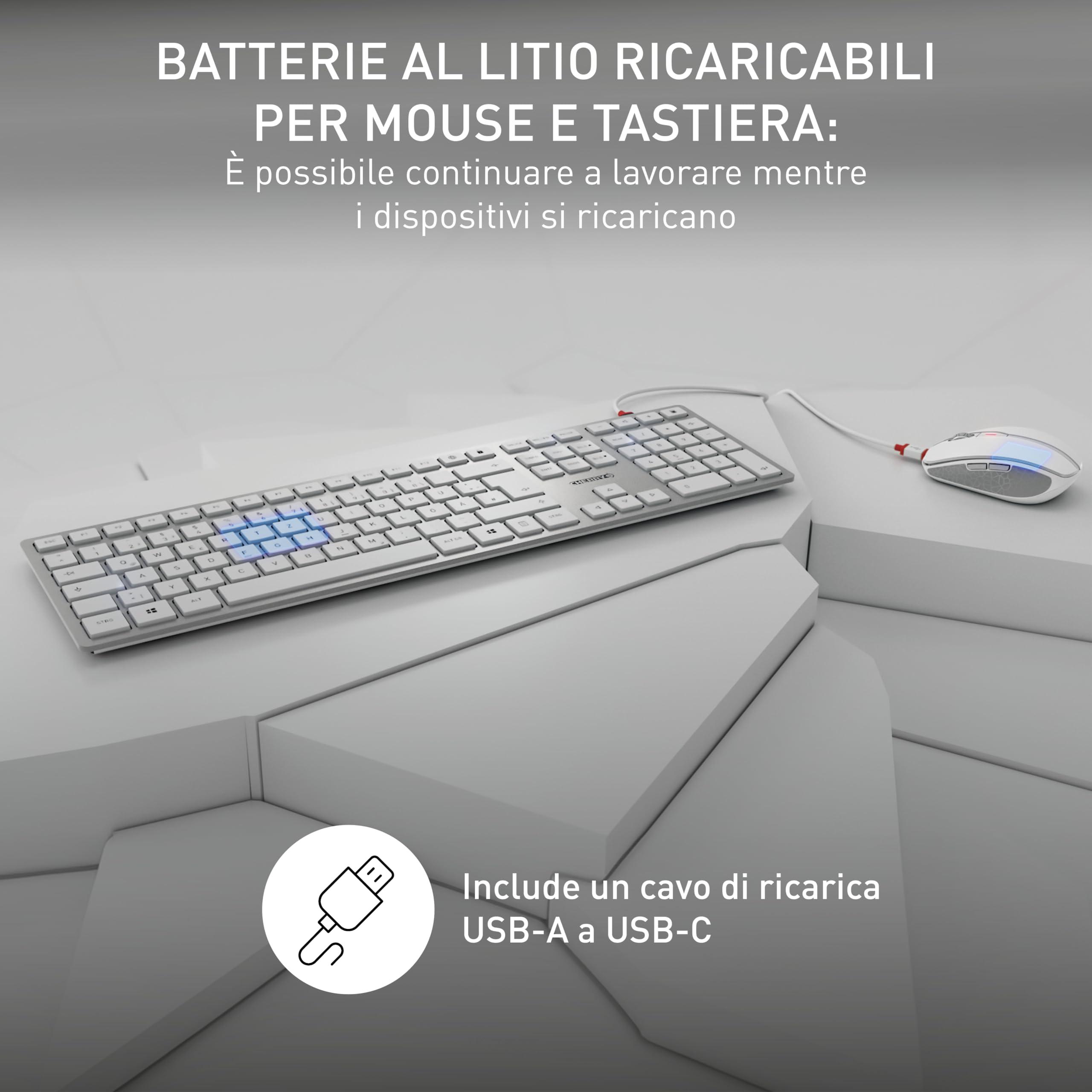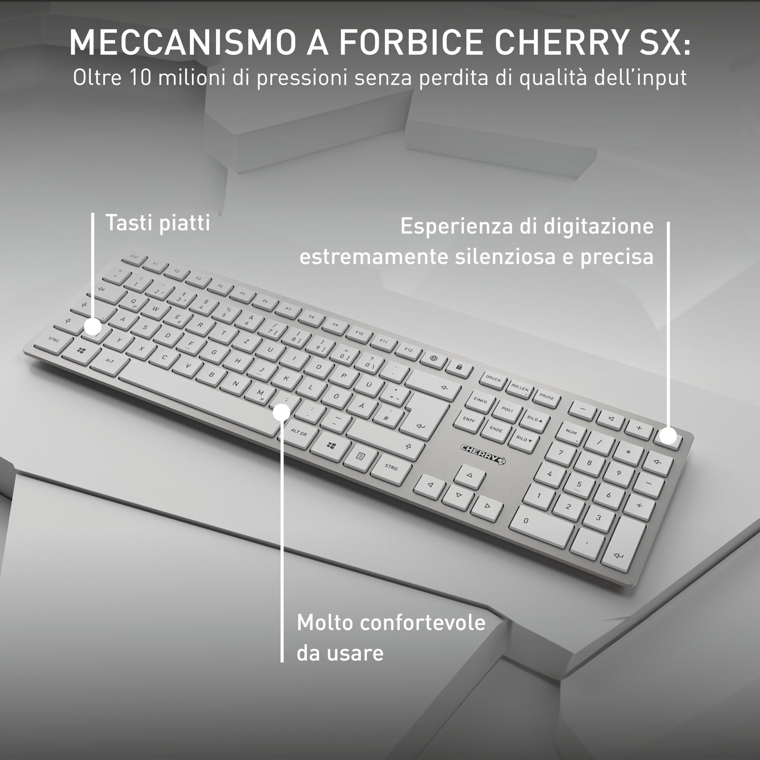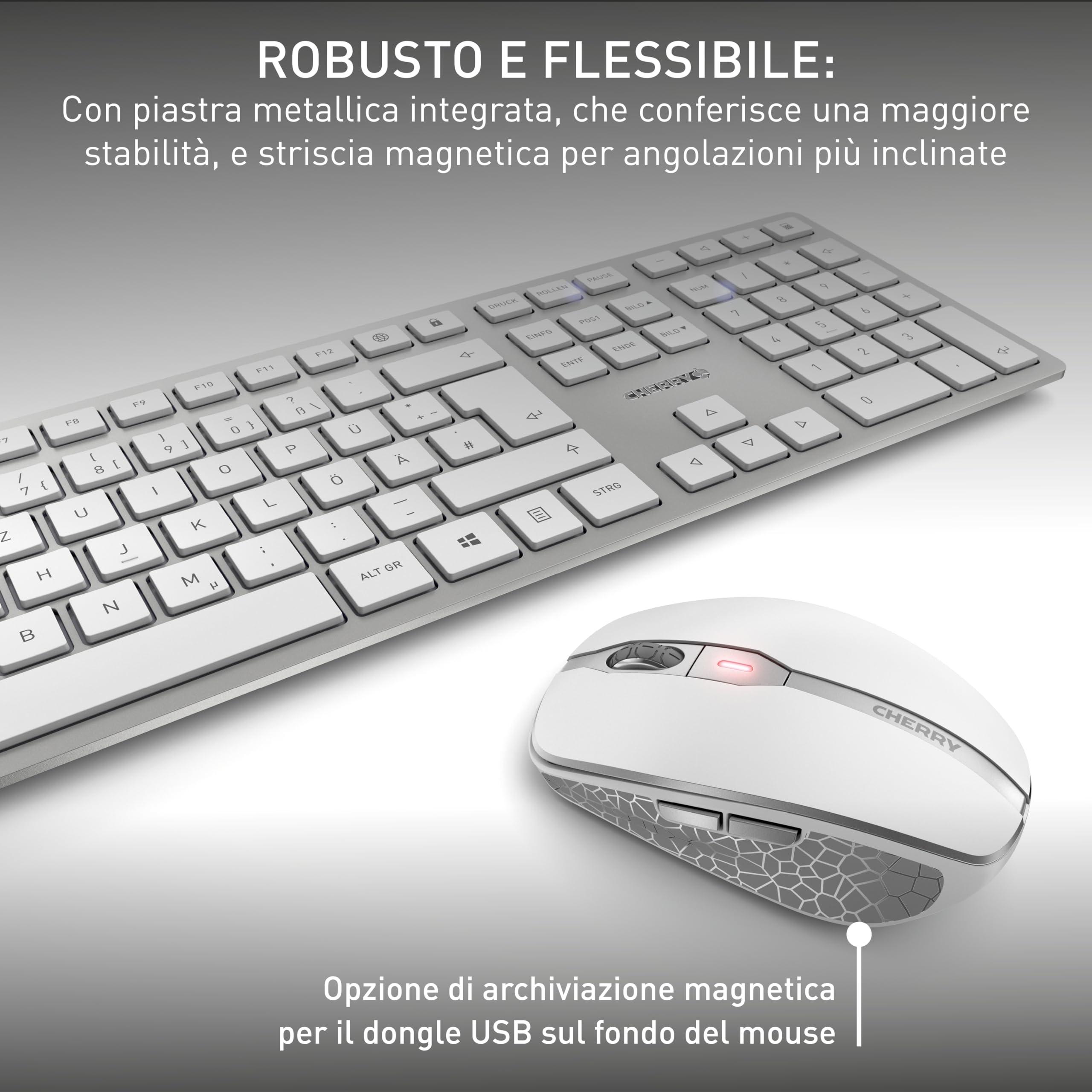 CHERRY DW 9100 SLIM, Set di Tastiera e Mouse Senza Fili, Layout per l'Unione Europea (QWERTY), Connessione Bluetooth e Wireless 2,4 GHz, Tasti Silenziosi, Design Piatto, Ricaricabile, Bianco-Argento