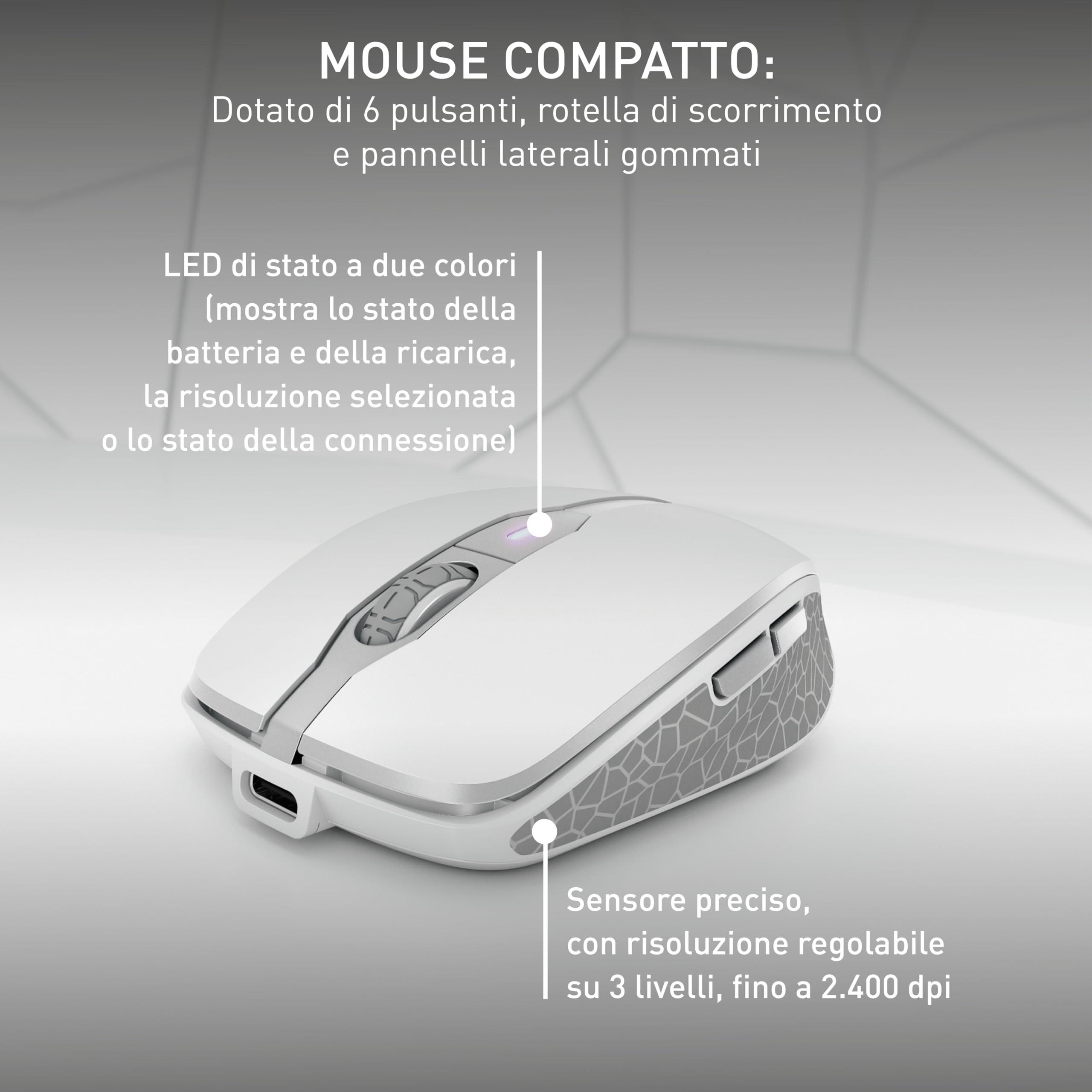- Mouse: 6 pulsanti, parti laterali gommate, forma compatta, sensore preciso con risoluzione regolabile su 3 livelli fino a 2400 dpi + alloggiamento magnetico per dongle USB