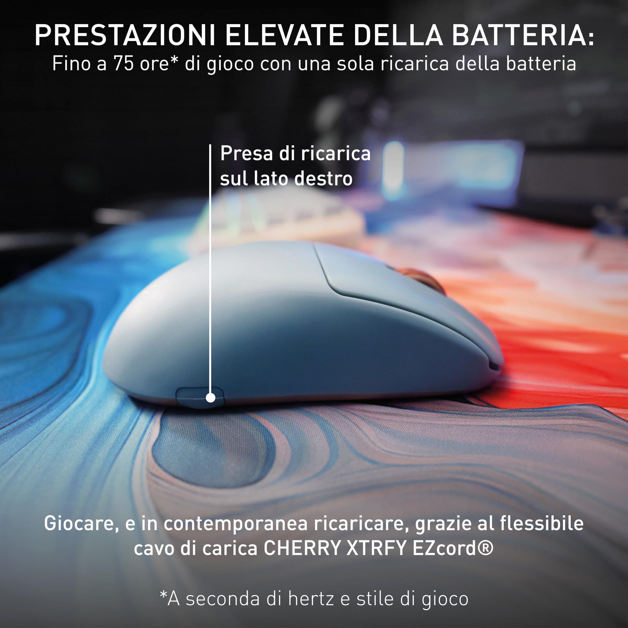 - Ricaricabile: A seconda della frequenza e dello stile di gioco, una carica dura fino a 75 ore. Durante la ricarica, puoi continuare a giocare senza interruzioni grazie al cavo di ricarica flessibile CHERRY XTRFY EZcord