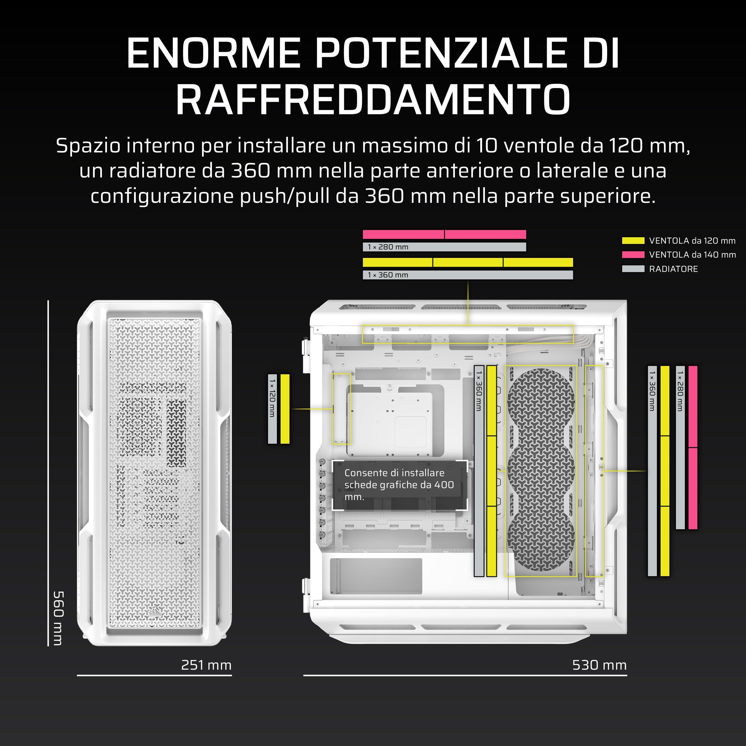 - Enorme potenziale di raffreddamento - L'interno spazioso ospita fino a 10 ventole di raffreddamento da 120 mm o 4 da 140 mm, nonché radiatori multipli da 60 mm di spessore, tra cui uno da 360 mm davanti o di lato e uno da 360 mm push/pull sul tetto