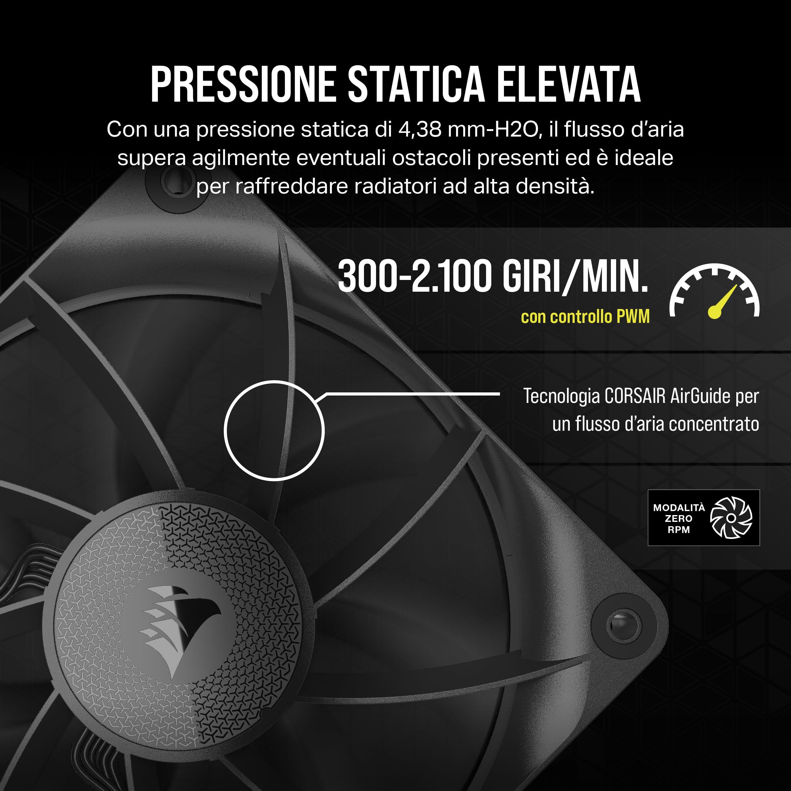 - Velocità controllate tramite PWM e iCUE LINK: Regolazione precisa della velocità della ventola fino a 2.100 RPM, per un flusso d'aria fino a 74,2 CFM.