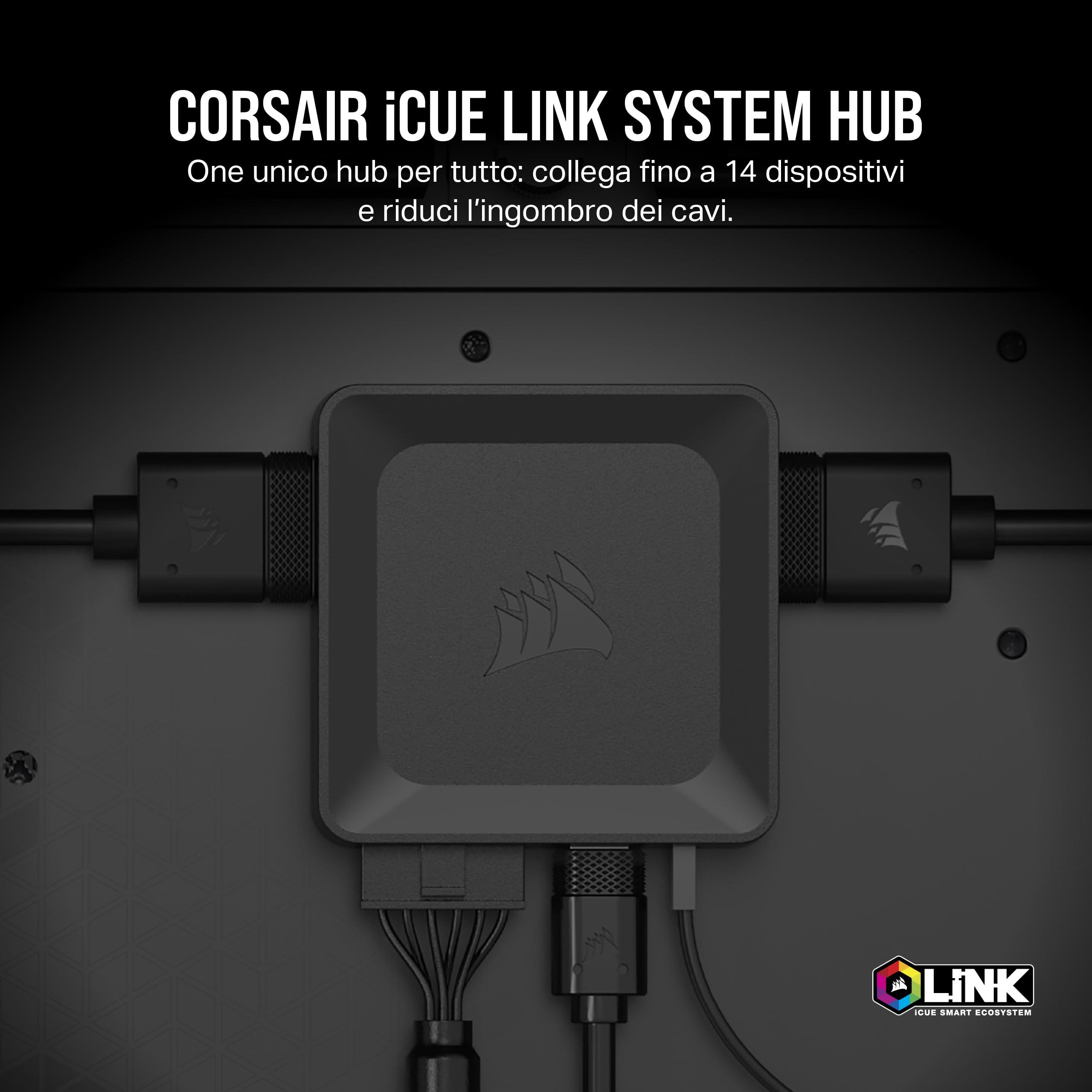 - Ottimizza il tuo sistema. Rendilo più smart: CORSAIR iCUE LINK System Hub consente di sincronizzare e gestire il raffreddamento del sistema e l’illuminazione RGB. Collega le ventole, il dissipatore della CPU, i componenti per custom cooling ed altri accessori utilizzando meno cavi che mai.