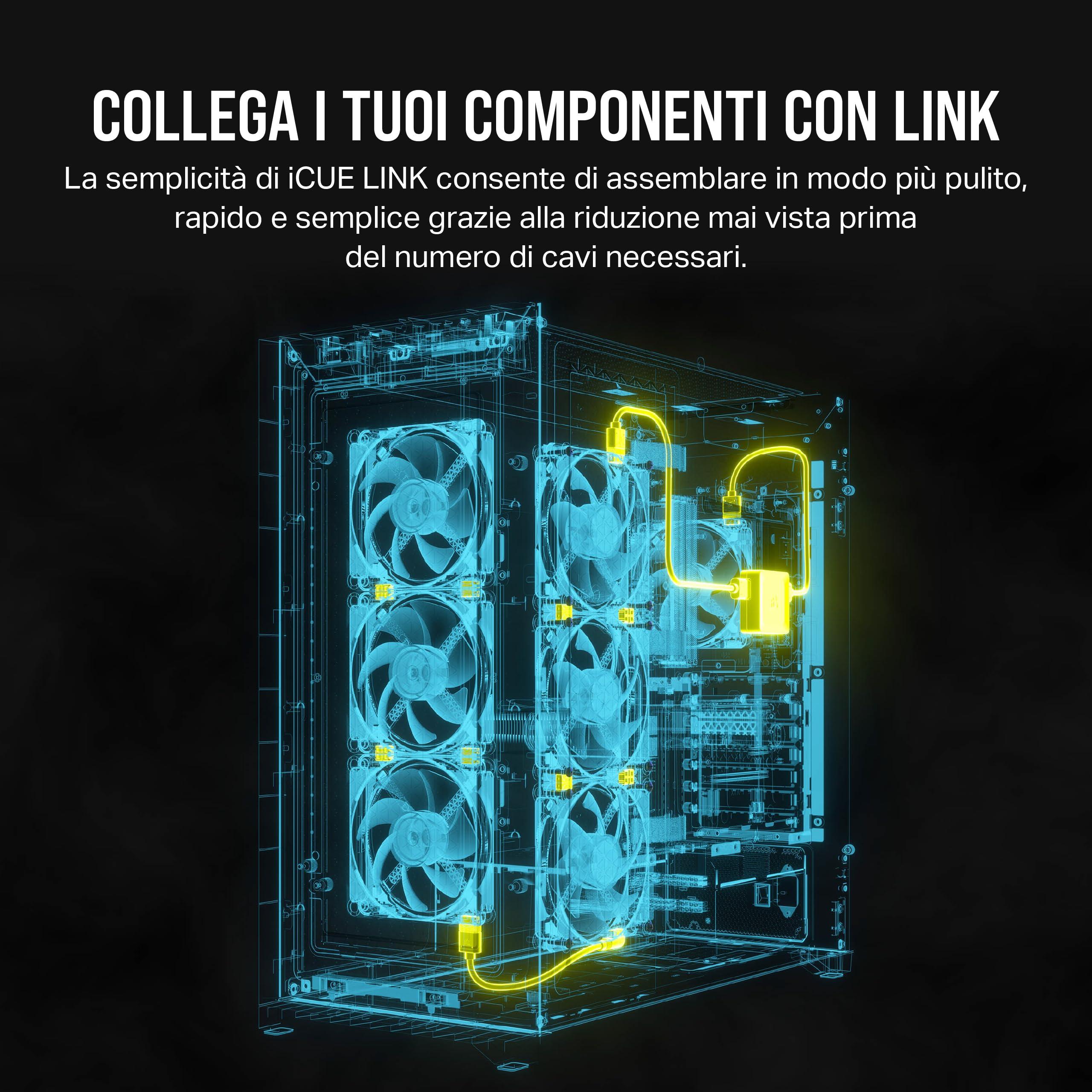 - Collega i tuoi componenti con LINK: Collega fino a 14 dispositivi compatibili con iCUE LINK e riduci in modo significativo l’ingombro dei cavi grazie all’innovativa soluzione con un unico cavo.