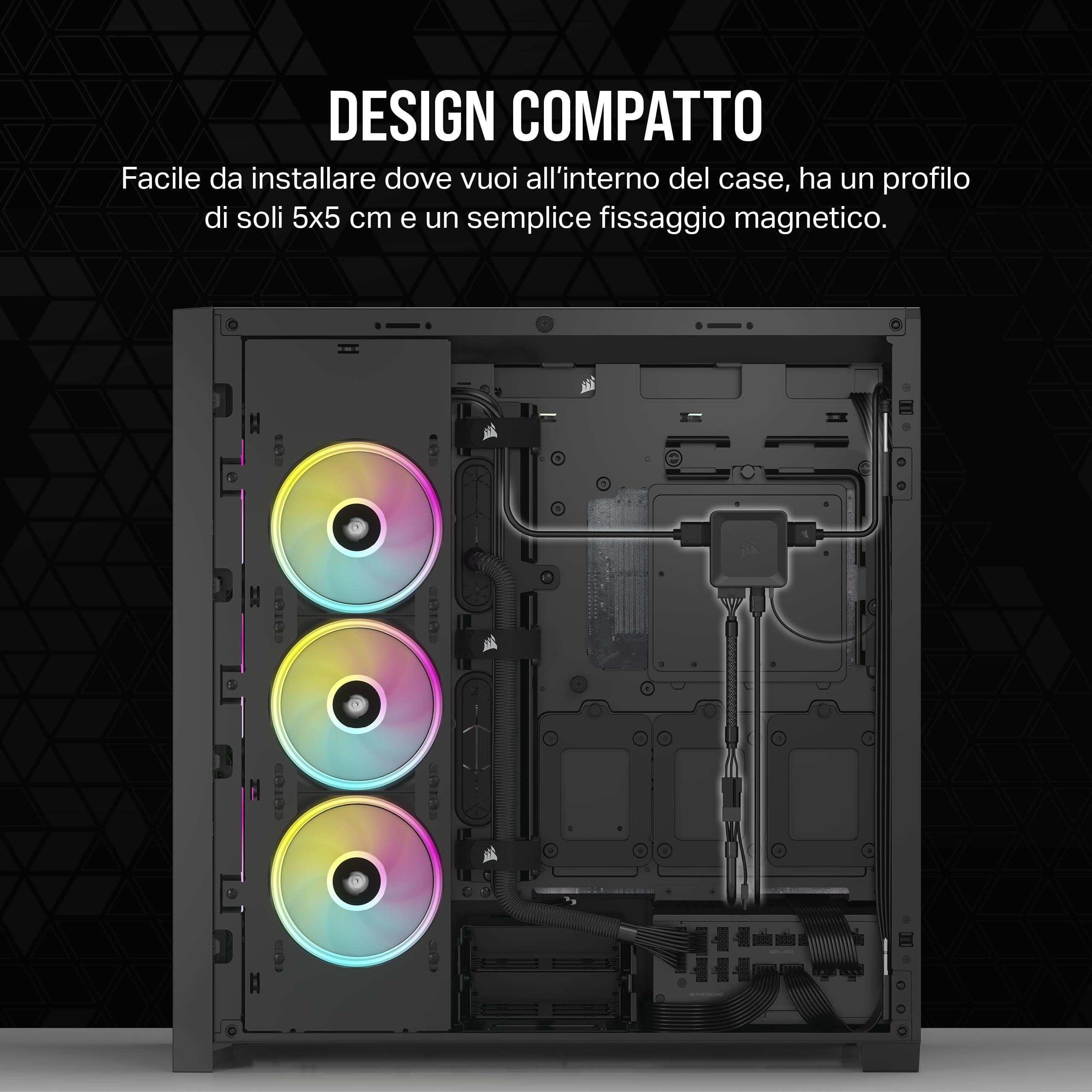 - Design compatto per un’installazione semplicissima: Il profilo compatto 5x5 cm (2x2”) consente di collegare facilmente iCUE LINK System a qualsiasi superficie metallica del case utilizzando l’attacco magnetico.