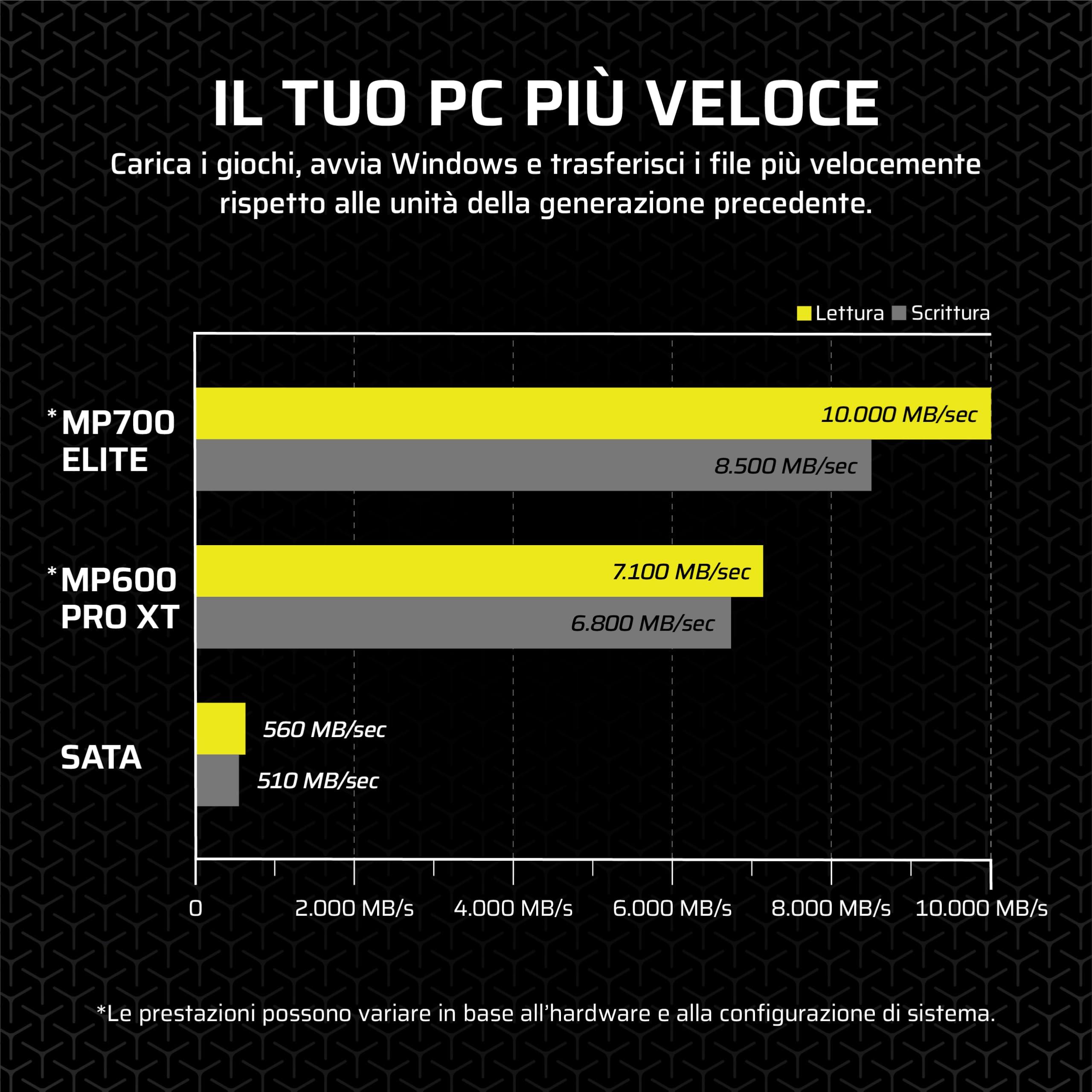 - Longevità eccezionale: l’unità MP700 ELITE assicura fino a 1.200 TB di operazioni di scrittura, una longevità eccezionale che permette di archiviare dati in modo sicuro per anni
