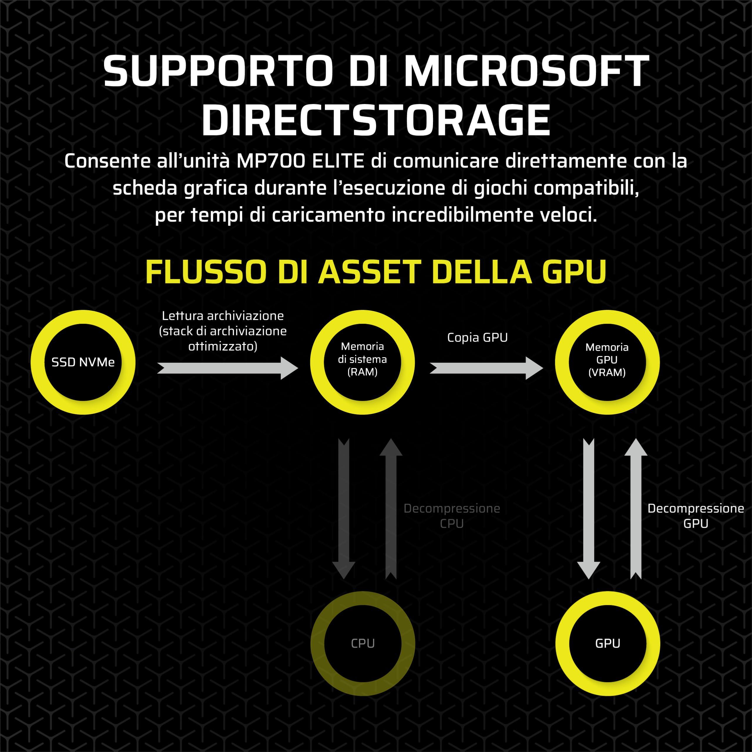 - Supporto di Microsoft DirectStorage**: consente all’unità MP700 ELITE di comunicare direttamente con la scheda grafica durante l’esecuzione di giochi compatibili, per tempi di caricamento incredibilmente veloci.**DirectStorage richiede una GPU DirectX12 con supporto per Shader Model 6.0
