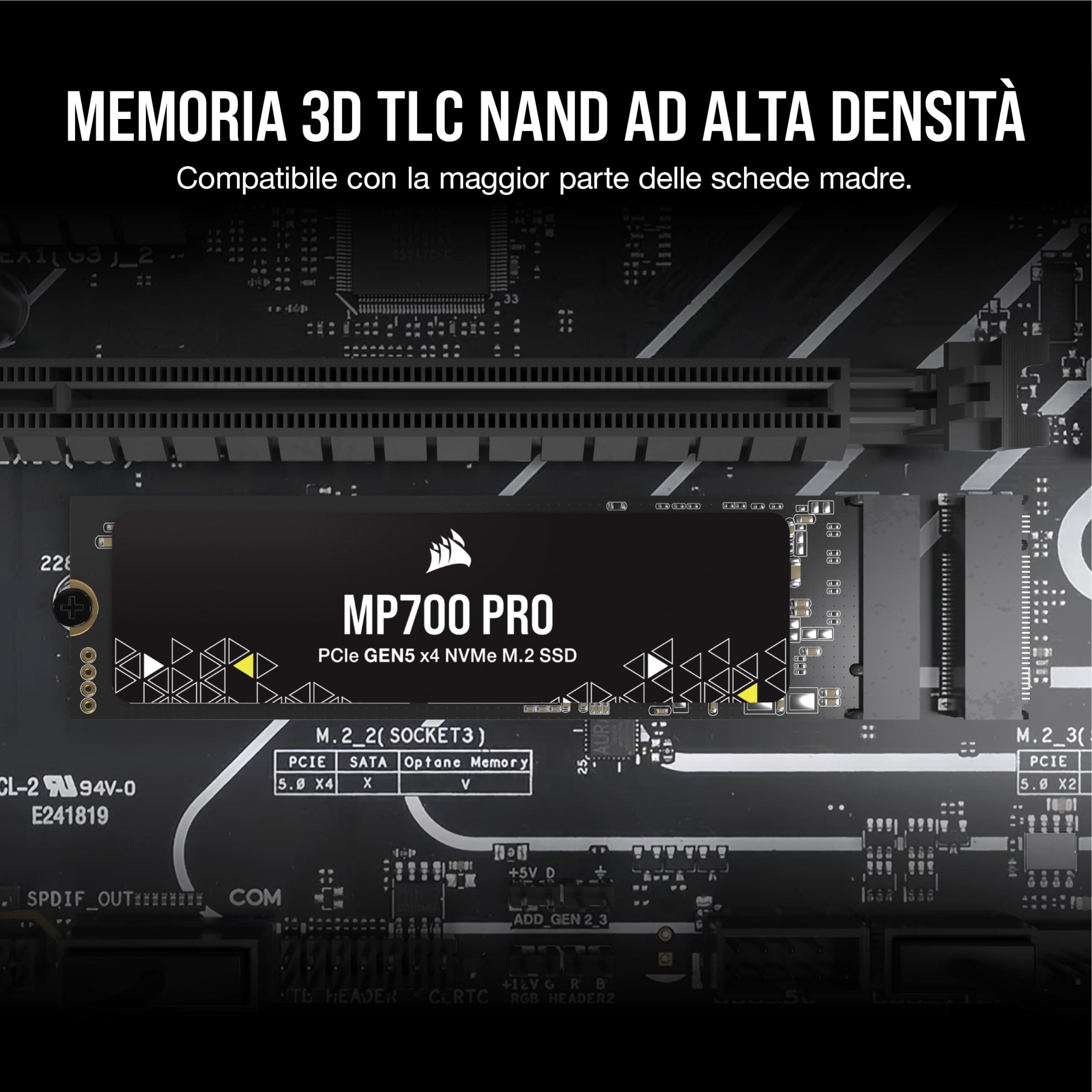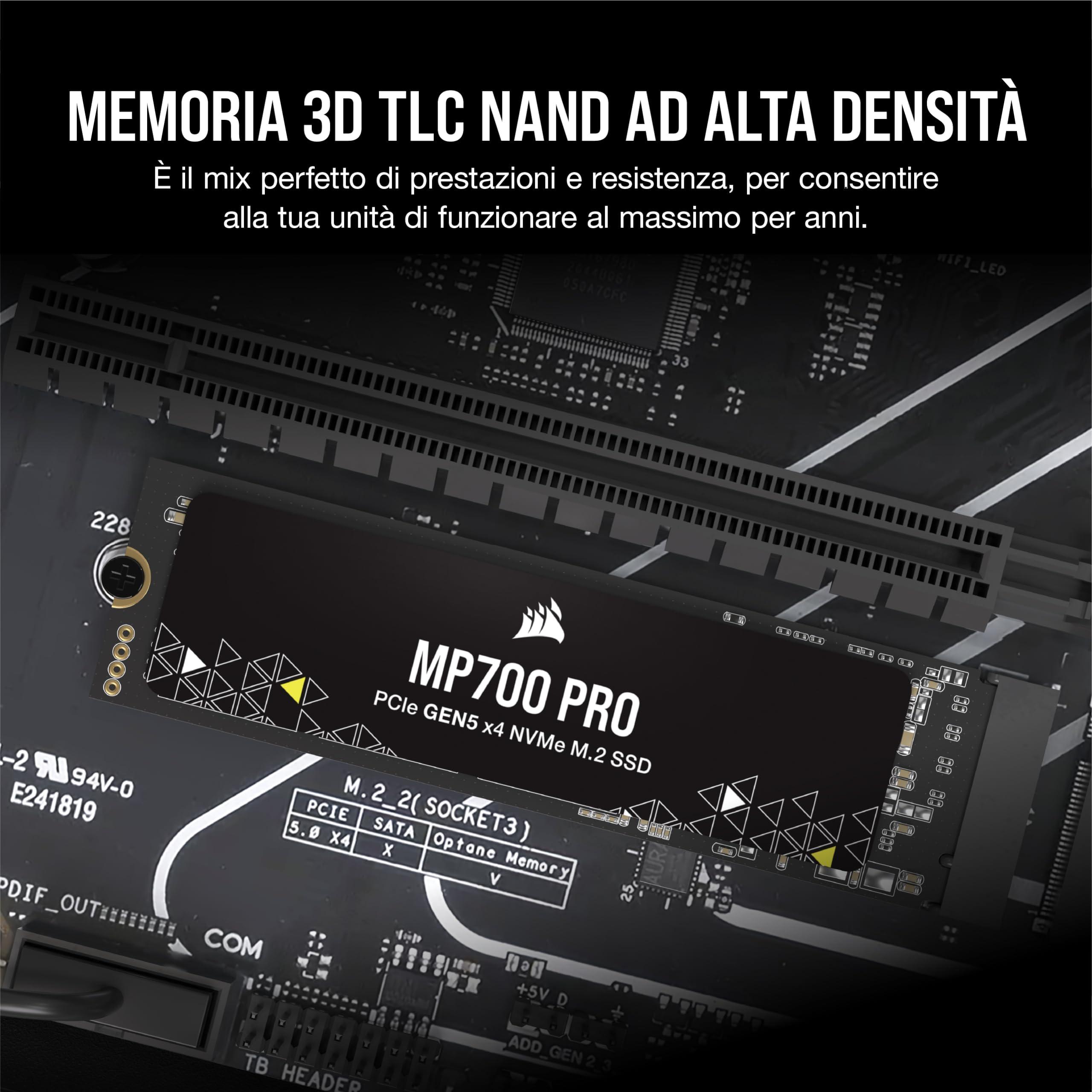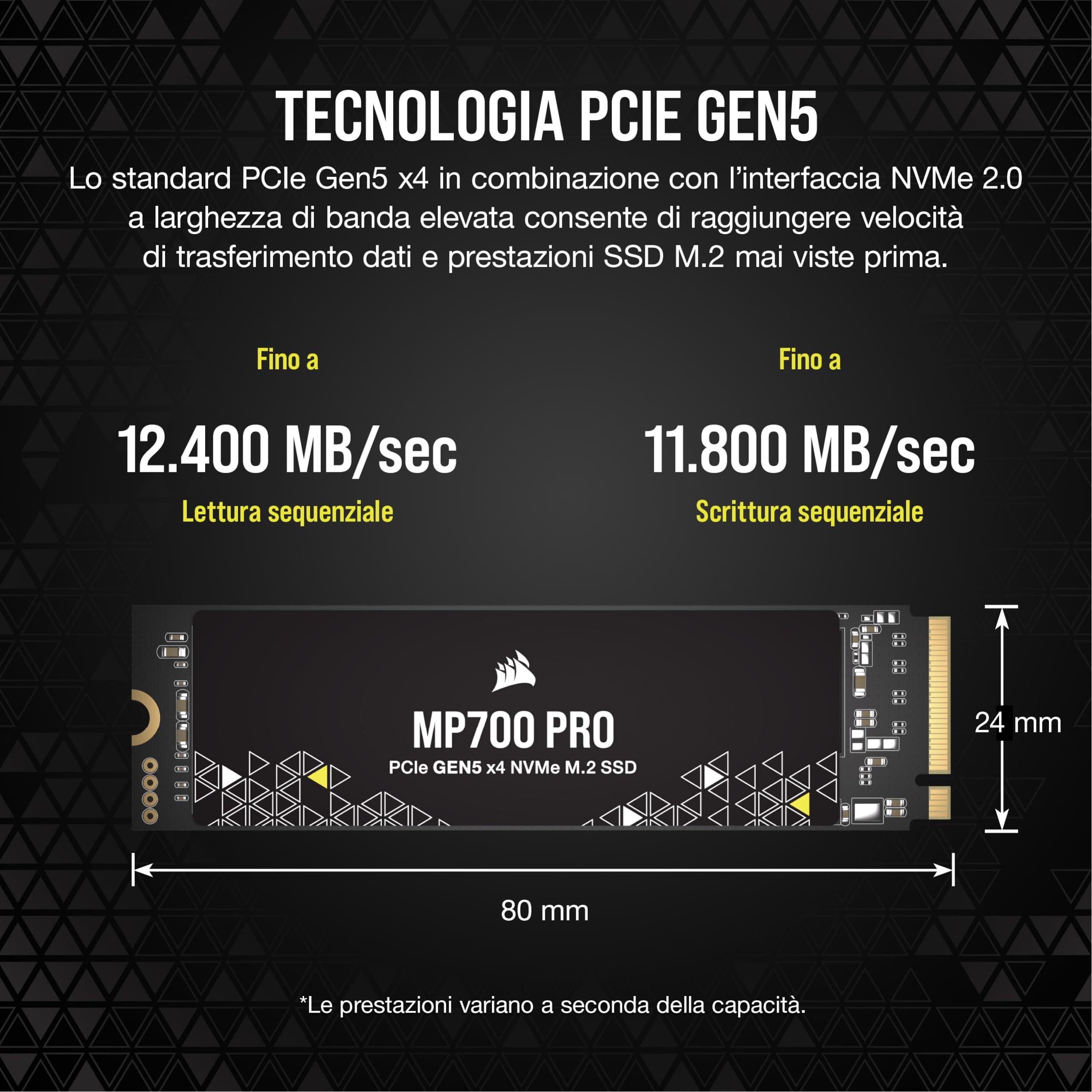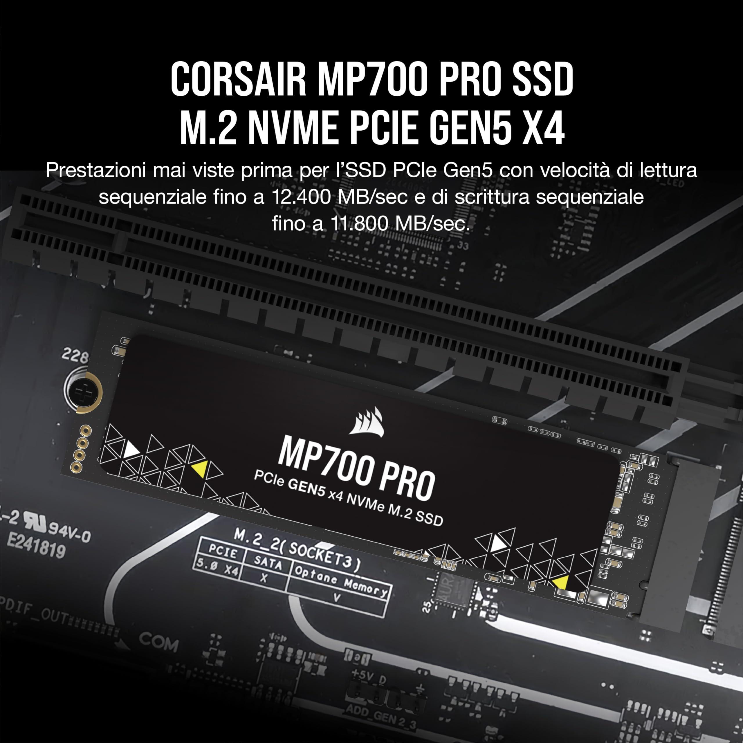 Corsair MP700 PRO 4TB M.2 PCIe Gen5 x4 NVMe 2.0 SSD - M.2 2280 - Fino a 12.400MB/sec in Lettura Sequenziale - NAND TLC ad Alta Densità - Nero