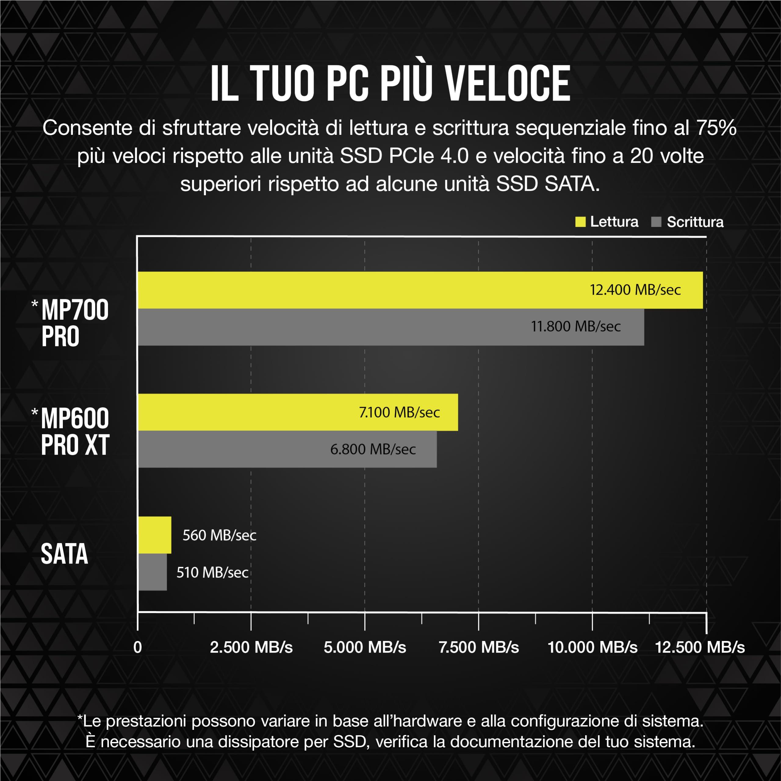 - Il tuo PC, ancora più veloce: carica titoli di gioco, avvia Windows e gestisci file di grandi dimensioni a una velocità senza precedenti, fino a 12.400 MB/s in lettura sequenziale e 11.800 MB/s in scrittura sequenziale.*Prestazioni e durabilità variano in base alla capacità.