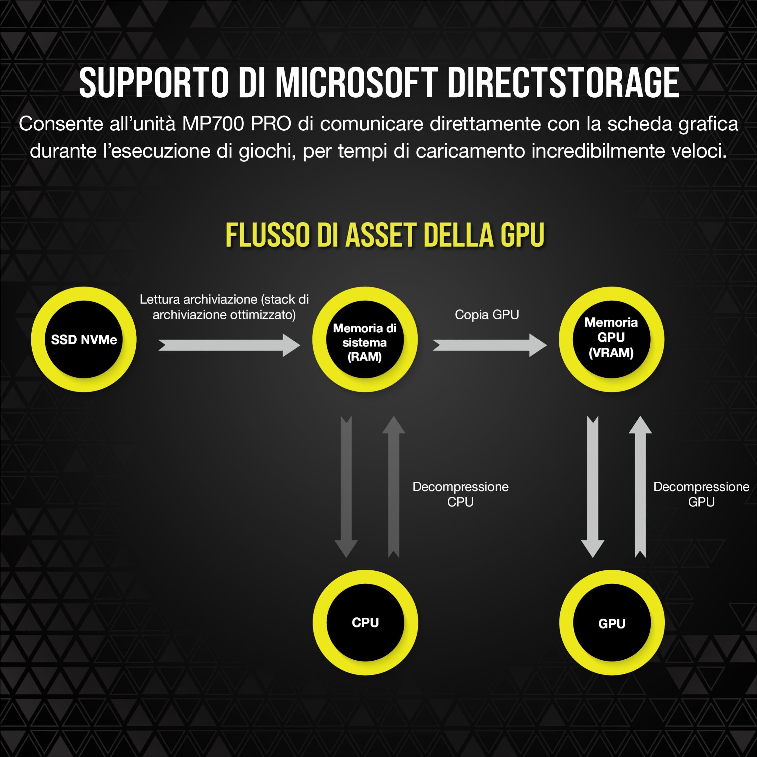 - Microsoft DirectStorage*: consente all’unità MP700 PRO di comunicare direttamente con la scheda grafica durante l’esecuzione di titoli di giochi compatibili, per tempi di caricamento incredibilmente veloci. *DirectStorage richiede una GPU DirectX12 con supporto per Shader Model 6.0.