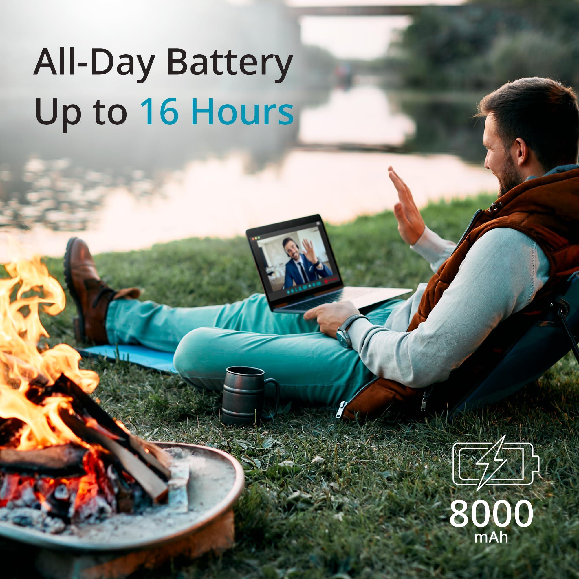 - Batteria per tutto il giorno – 8000 mAh per un’autonomia fino a 16 ore, ideale in viaggio e al lavoro.