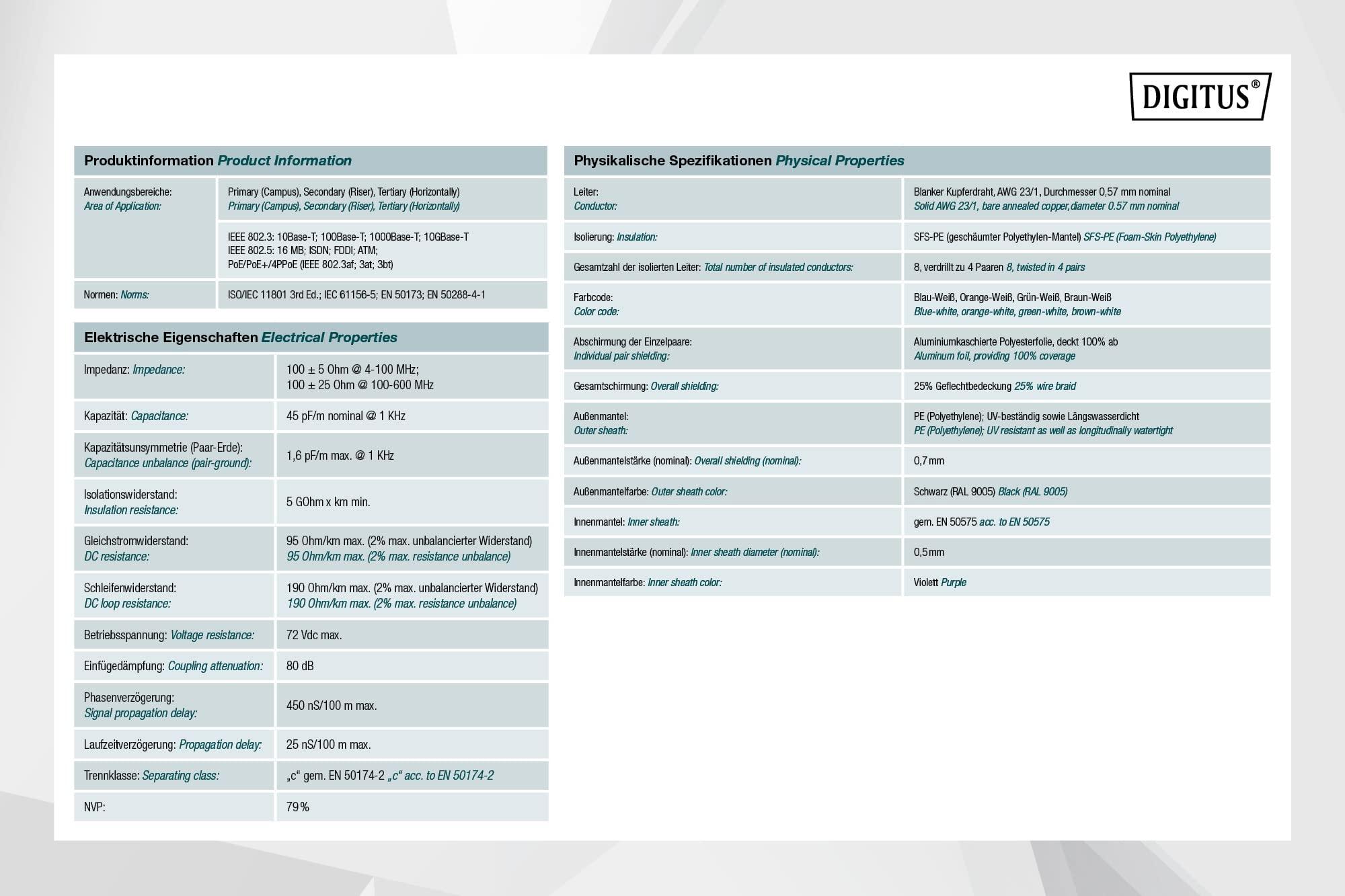 - PROTEZIONE ANTINCENDIO: Il cavo dati è conforme alla Euroclasse CPR Regolamento sui prodotti da costruzione secondo EN 50575 – LSZH privo di alogeni resistente alla fiamma a bassa emissione di fumo – Guaina interna viola (spessore 0,5 mm) – Guaina esterna