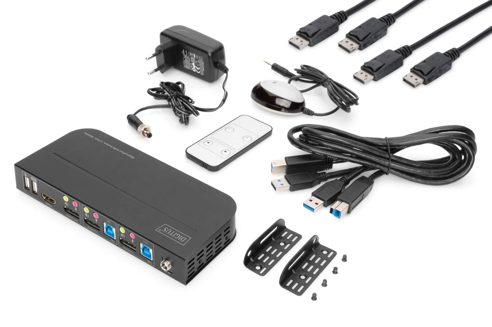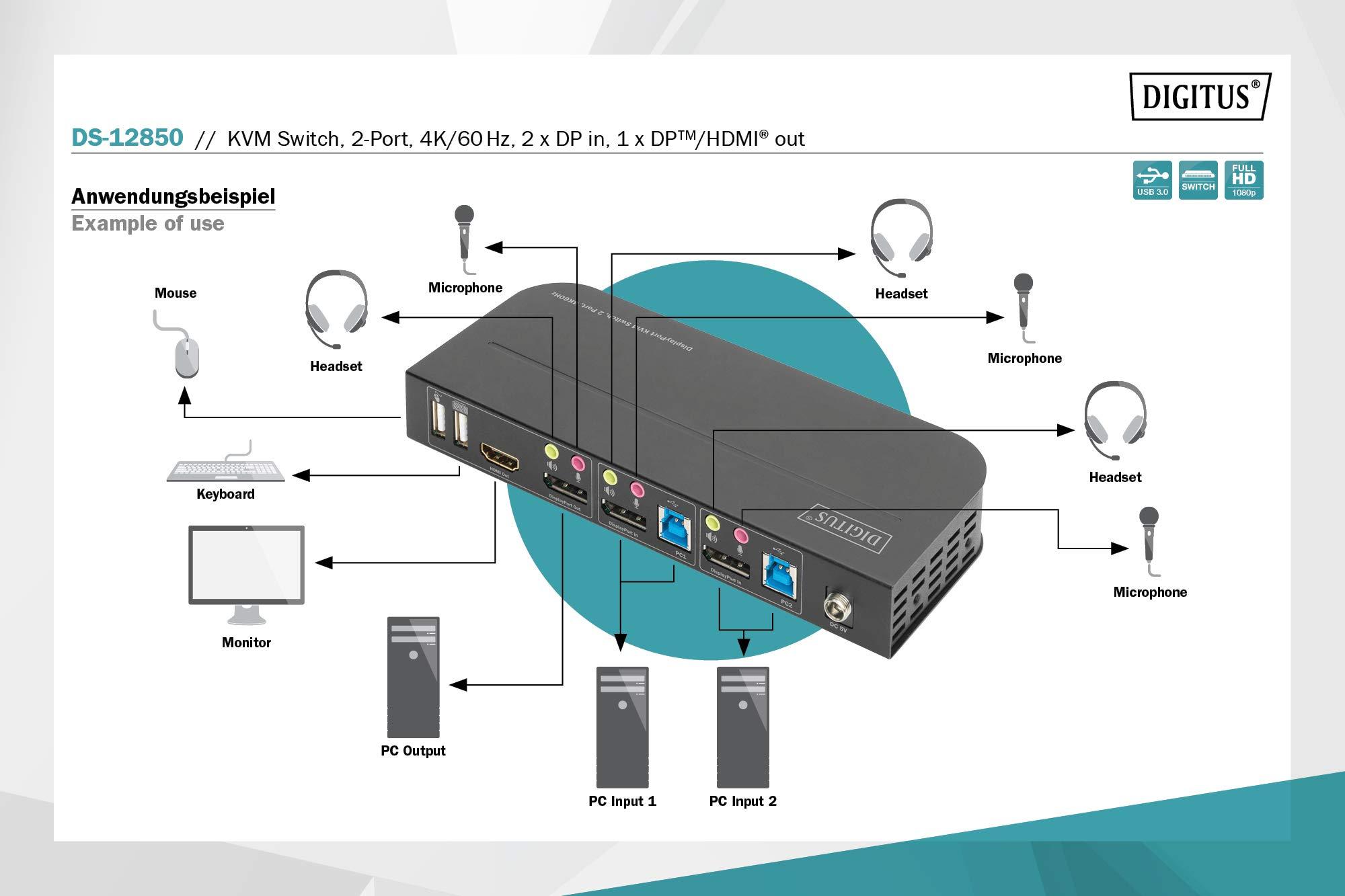 DIGITUS KVM Switch DisplayPort – Display singolo a 2 porte – 2 PC 1 Monitor – 1x Mouse, tastiera e audio per 2 computer – UHD 4K@60Hz (4096 x 2160p) – Hot-Key KVM Switch – 2x Hub USB 3.0 – Nero
