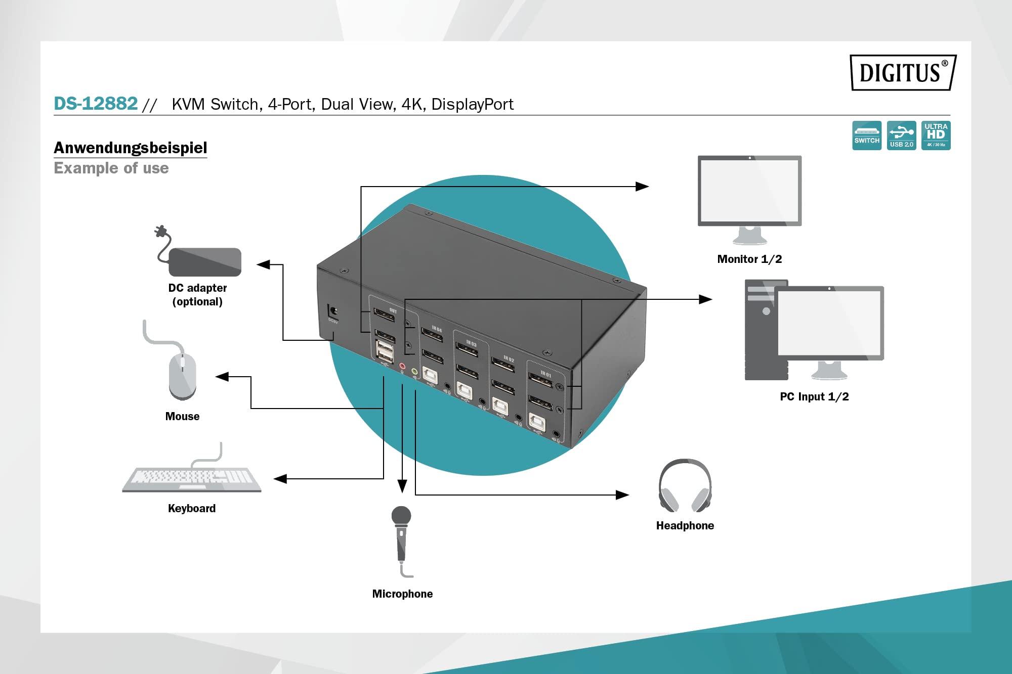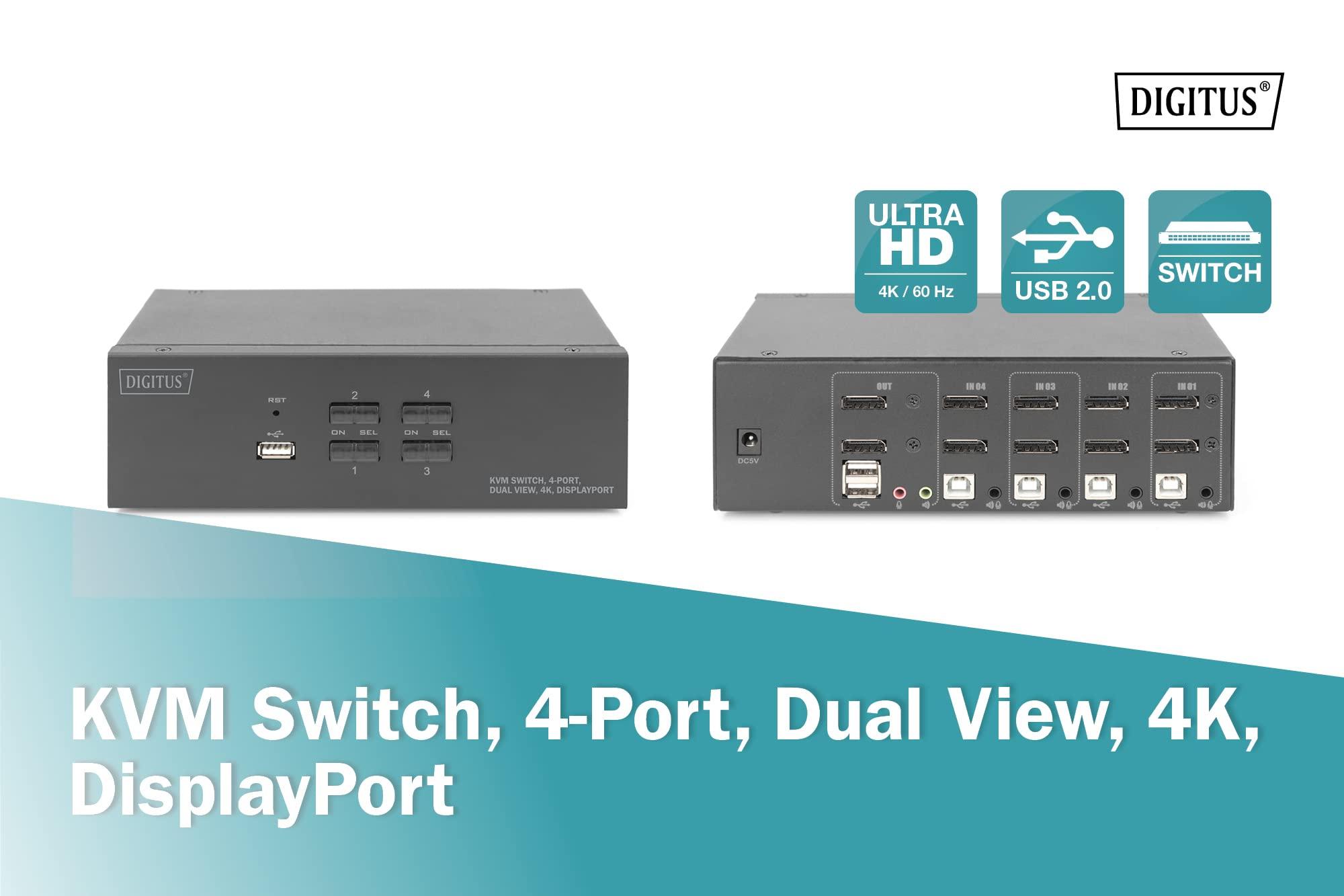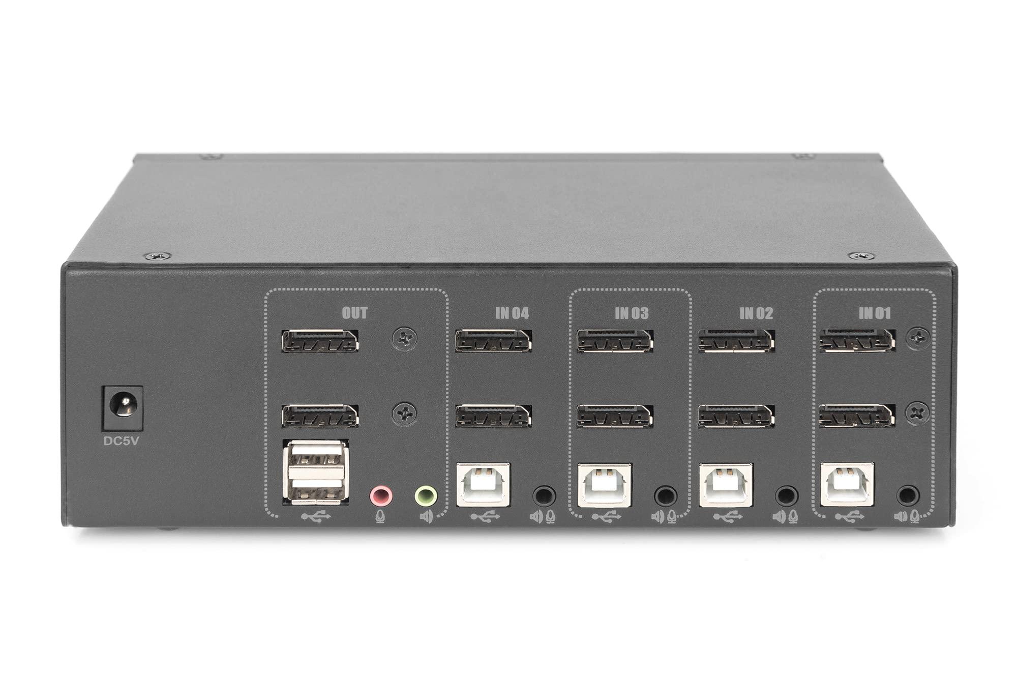 DIGITUS KVM Switch DisplayPort – Doppio display a 4 porte – 4 PC 2 monitor – 1x mouse, tastiera e audio per 4 computer – UHD 4K@60Hz (3840 x 2160p) – Hot-Key KVM Switch – 1x Hub USB 2.0 – Nero