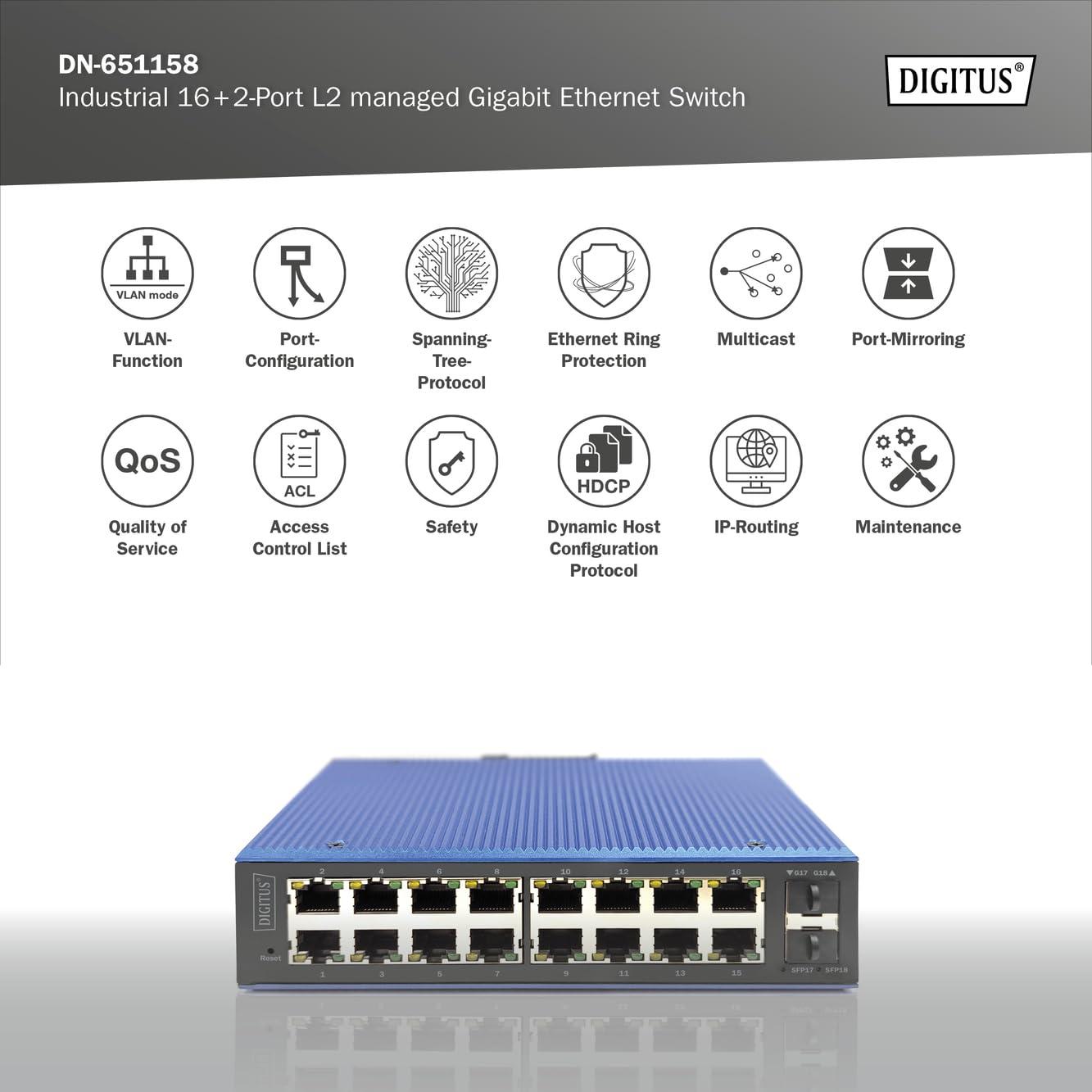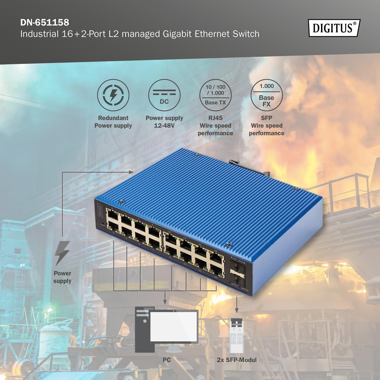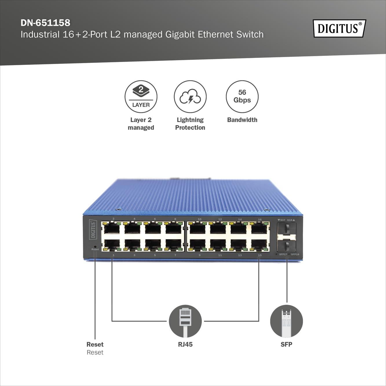 DIGITUS Switch di Rete - 18 Porte Gigabit Ethernet - 16x RJ45 + 2X SFP - IP40 - L2 gestito - 10/100/1000 Mbit/s - Montaggio su Guida DIN - Serie Industriale - Nero/Blu