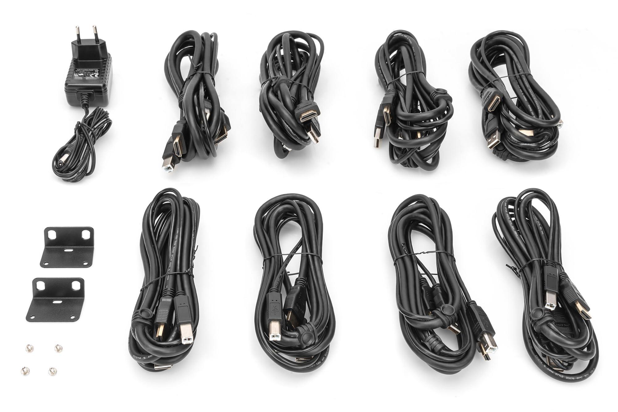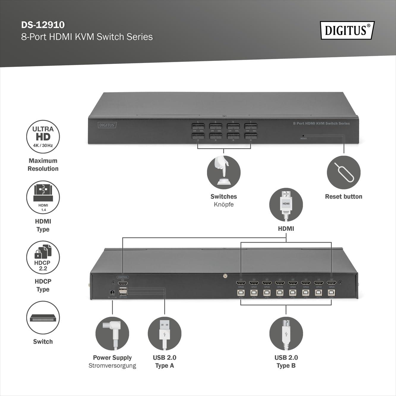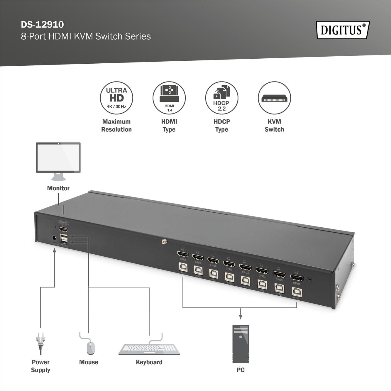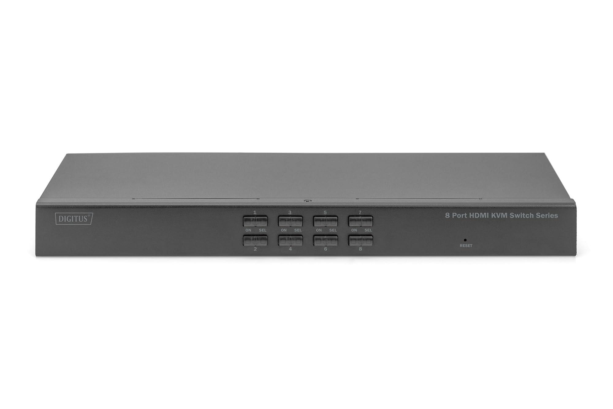DIGITUS Switch KVM HDMI a 8 Porte - Comunicazione DDC - HDMI 1.4, HDCP 2.2 - UltraHD 4k30Hz - Porte USB per Mouse e Tastiera - Commutazione con Tasti di Scelta Rapida - Nessun Driver richiesto - Nero