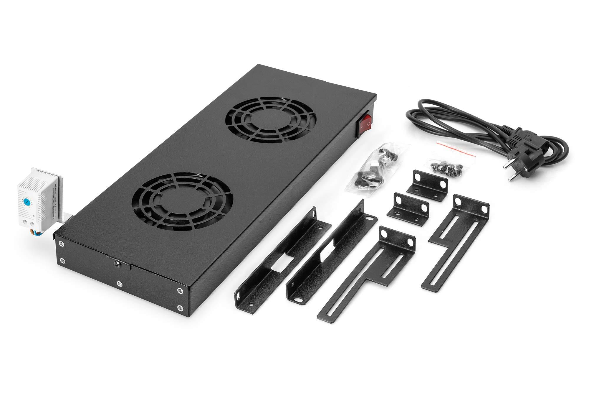 DIGITUS Unità di ventilazione per armadio di rete da 19 pollici – 2 ventole – Montaggio variabile su guide profilate da 19 pollici – 1 U – Termostato – Portata d'aria 4,6 m³ al minuto – Nero