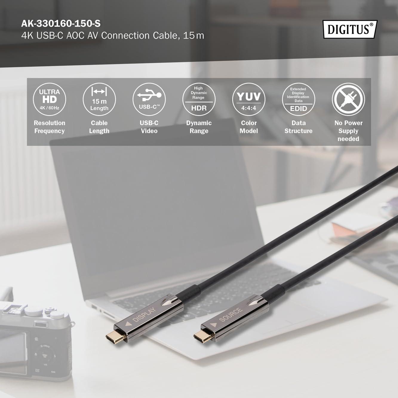 Digitus USB-C AOC Cavo di collegamento AV ibrido in fibra ottica - USB 3.1 - Displayport 1.2 - DP Alt-Mode - Plug&Play - Cavo audio/video - 15m - nero