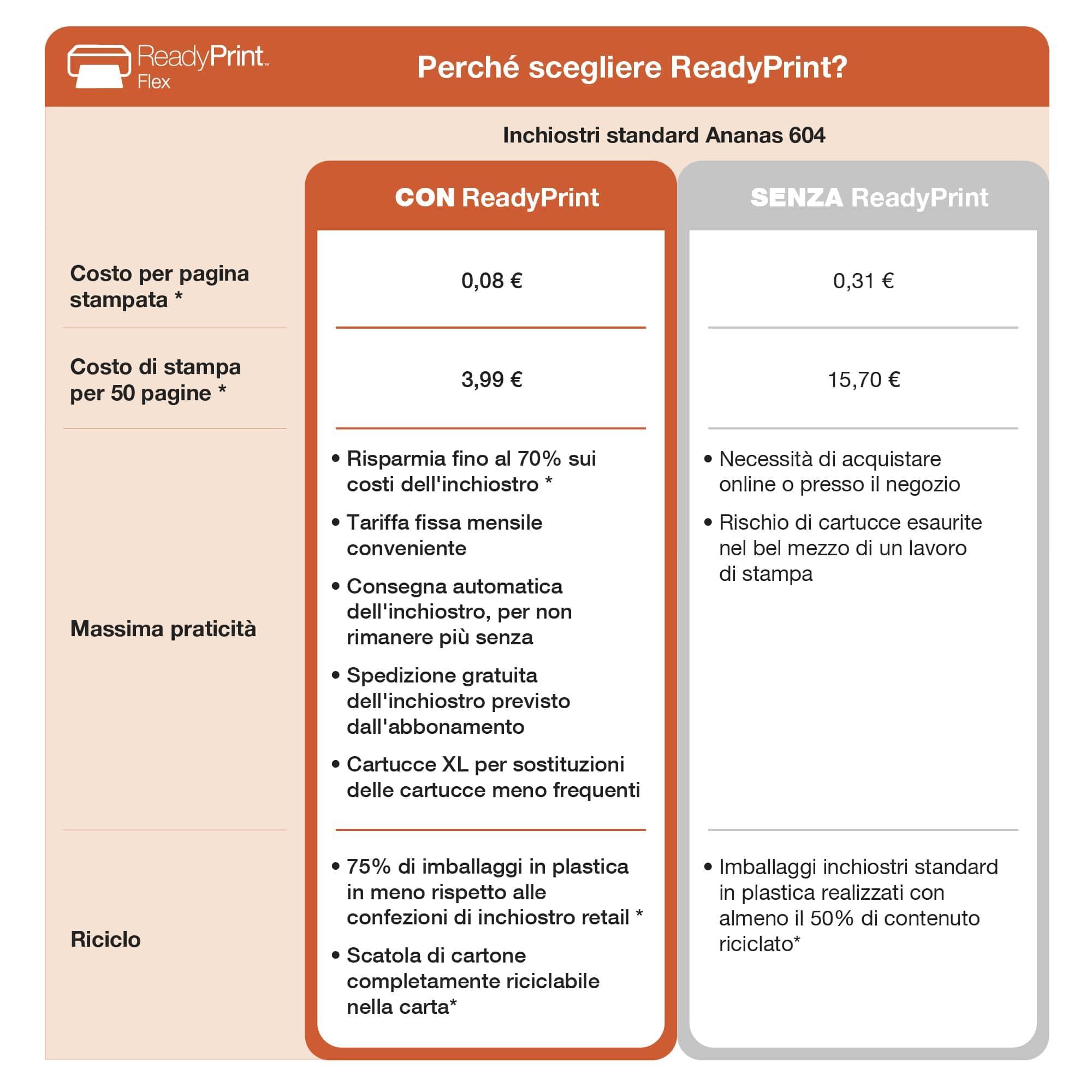 - 3 mesi di abbonamento gratuito a ReadyPrint Flex.* I nuovi clienti possono ottenere i primi 3 mesi gratis iscrivendosi con il codice AMAZON3. Registrati e risparmia fino al 70%* sui costi dell’inchiostro* con ReadyPrint Flex: non resterai più senza. I tuoi livelli di inchiostro vengono monitorati e i nuovi inchiostri vengono inviati direttamente a casa tua, prima che si esauriscano!
