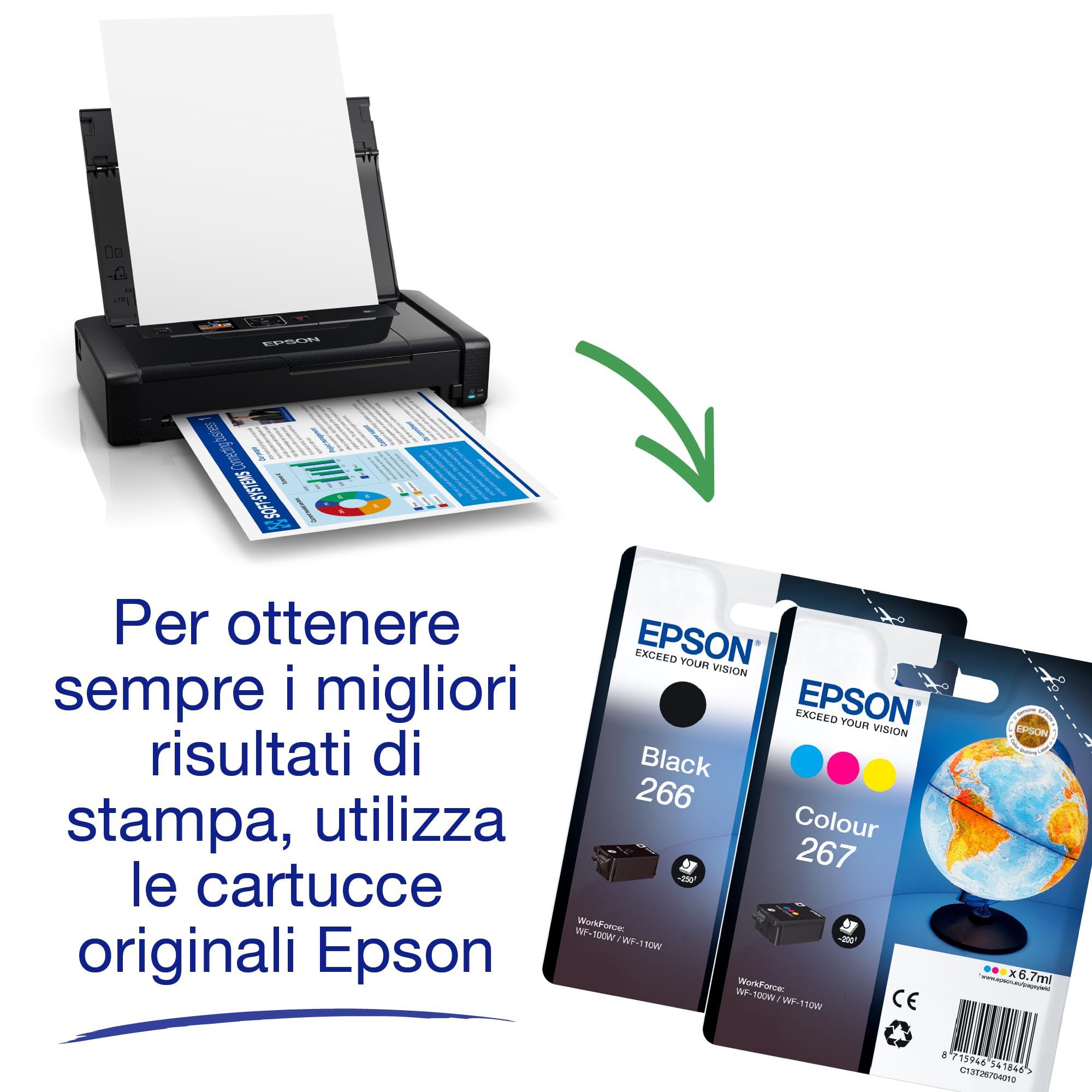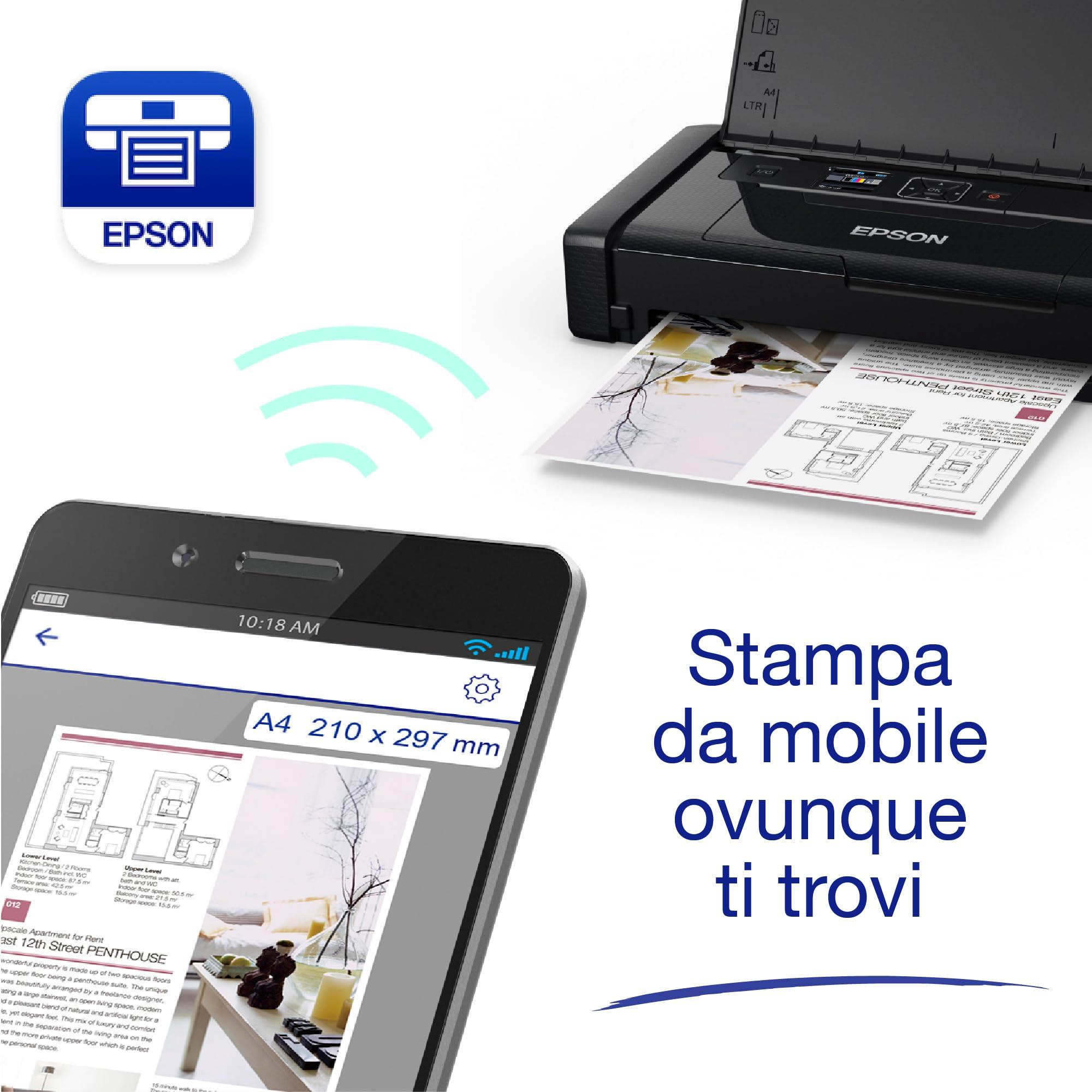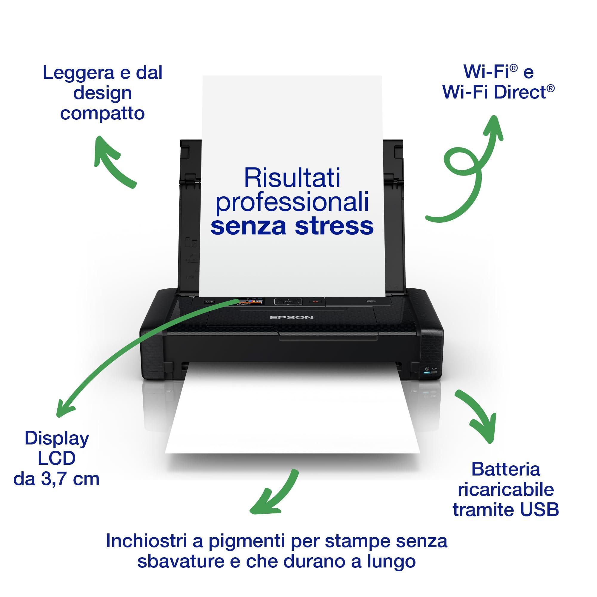Epson Workforce WF-110W, Stampante A4 Portatile Inkjet, Connettività Wi-Fi e Wi-Fi Direct, Batteria Integrata,Display LCD, 7 ppm in bianco/nero, Nero