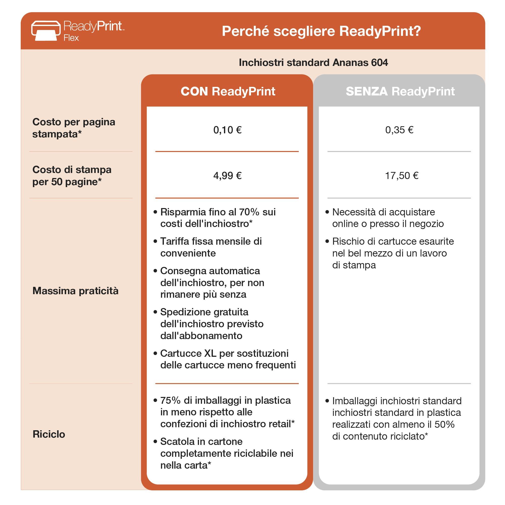 - 3 mesi di abbonamento gratuito a ReadyPrint Flex.* I nuovi clienti possono ottenere i primi 3 mesi gratis iscrivendosi con il codice AMAZON3. Registrati e risparmia fino al 70%* sui costi dell’inchiostro* con ReadyPrint Flex: non resterai più senza. I tuoi livelli di inchiostro vengono monitorati e i nuovi inchiostri vengono inviati direttamente a casa tua, prima che si esauriscano!