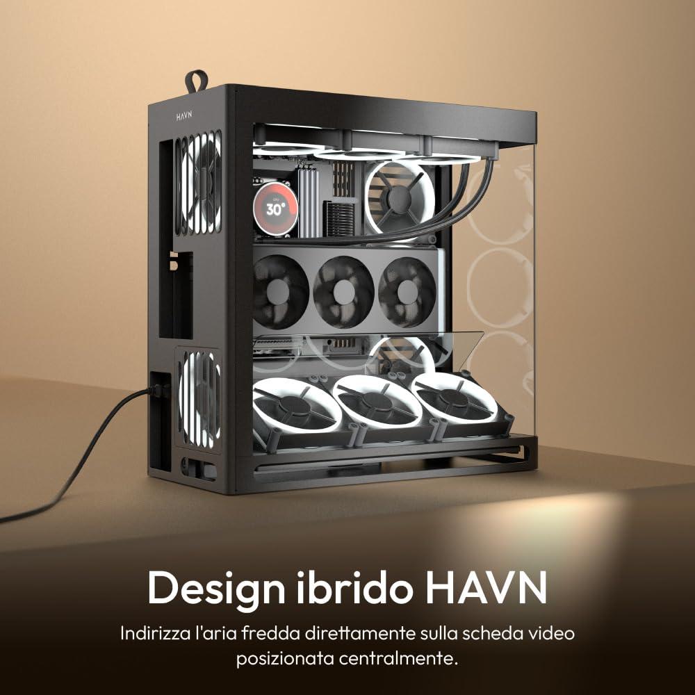 - HAVN Design ibrido per un raffreddamento ottimale della GPU: custodia ATX con design a doppia camera e flusso d'aria bilanciato, che dirige l'aria fresca dall'ingresso inferiore direttamente alla GPU posizionata centralmente.