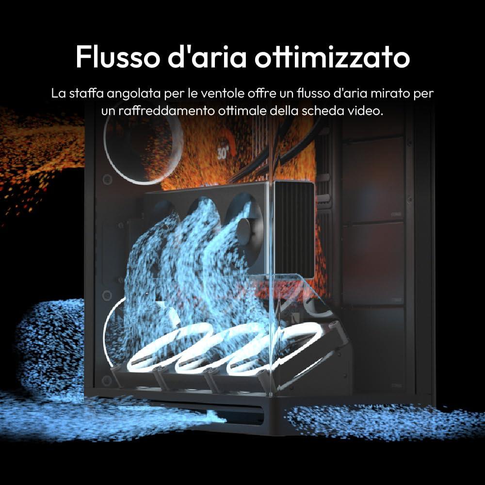 - Flusso d'aria mirato: il supporto angolato della ventola nella parte inferiore della custodia dirige l'aria fresca fresca direttamente alla GPU montata verticalmente, garantendo un raffreddamento ottimale e massime prestazioni.