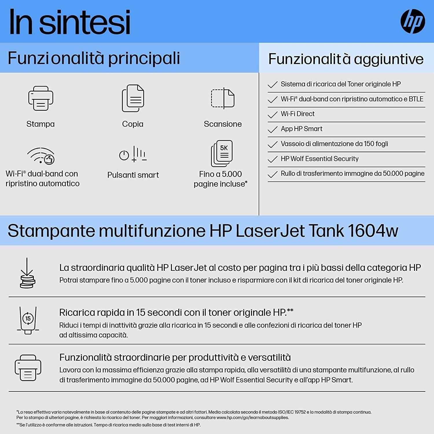 - Stampante HP LaserJet Tank 1604w 381L0A con toner originale HP già preinstallato all’interno del serbatoio per stampare fino a 5000 pagine; velocità di stampa fino a 22 ppm nel formato A4